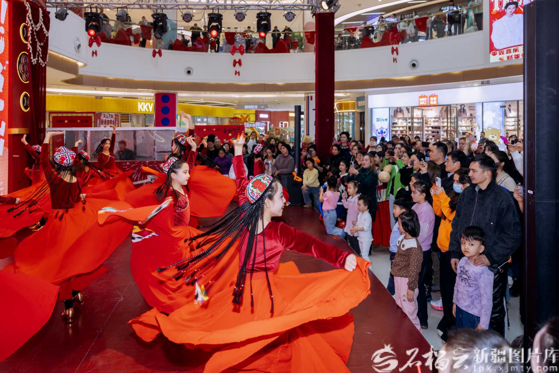 2月20日,在乌鲁木齐天山万科广场中庭,特色节目表演吸引消费者驻足观看。受访者供图