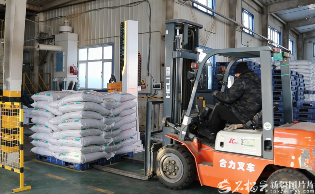 2月25日,在福海县大尾羊有限责任公司的金圣康饲料厂内,叉车司机正熟练地转运饲料原料。柴林林 摄