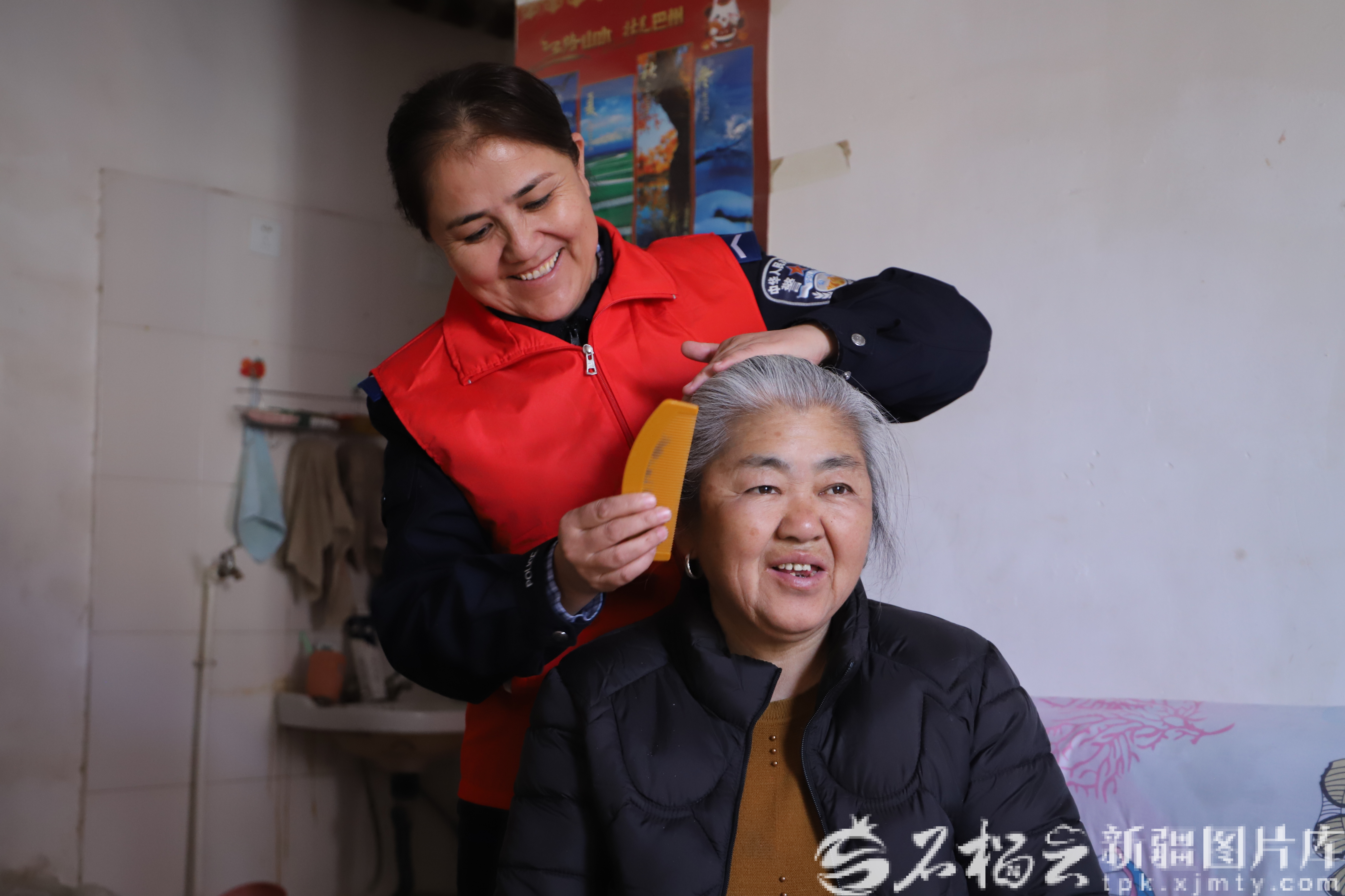 3月4日,且末县公安局且末镇派出所开展学雷锋志愿服务活动,辅警热依汗古丽·吐尔逊来到辖区独居老人家中,为老人梳头打理、整理家居。且末县公安局供图
