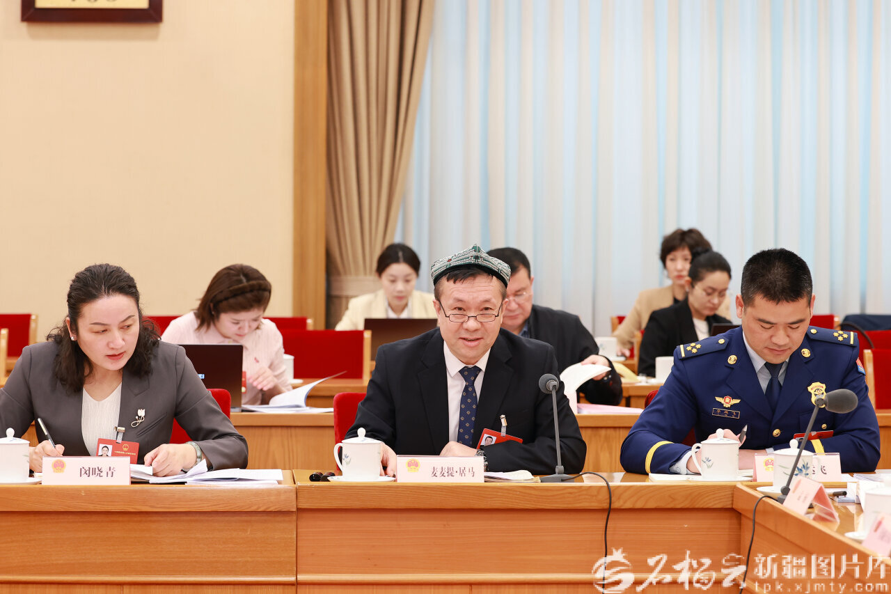 图为木沙江·海拉特代表(前排左)在发言时提出加大农牧区特色文旅发展扶持力度、深入实施文明乡风建设工程等建议。天山网-新疆日报记者 崔志坚摄