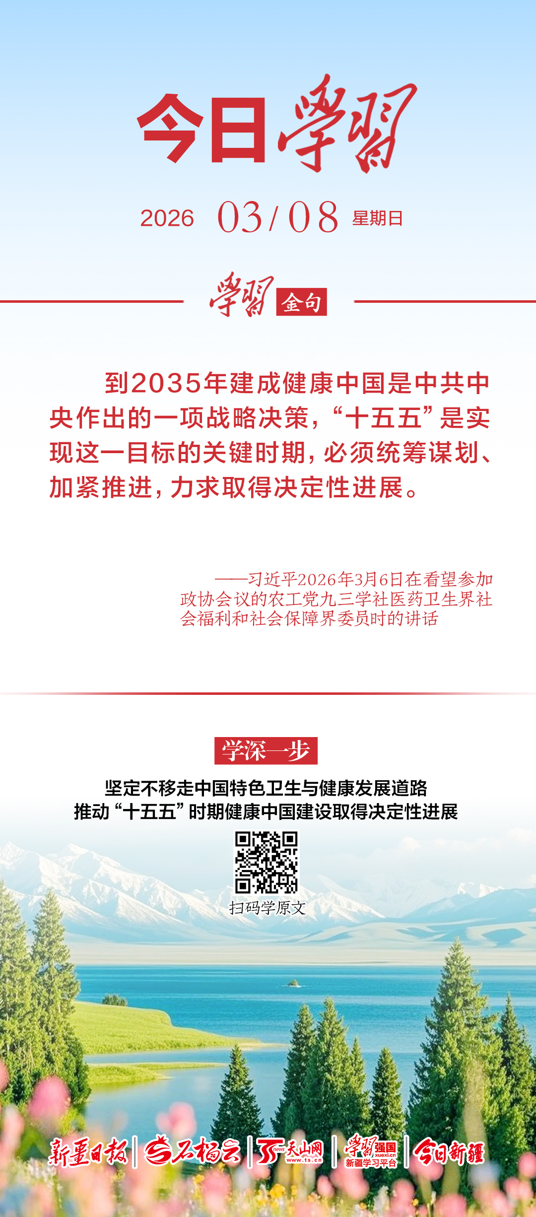 到2035年建成健康中国是中共中央作出的一项战略决策,“十五五”是实现这一目标的关键时期,必须统筹谋划、加紧推进,力求取得决定性进展。 ——习近平2026年3月6日在看望参加政协会议的农工党九三学社医药卫生界社会福利和社会保障界委员时的讲话