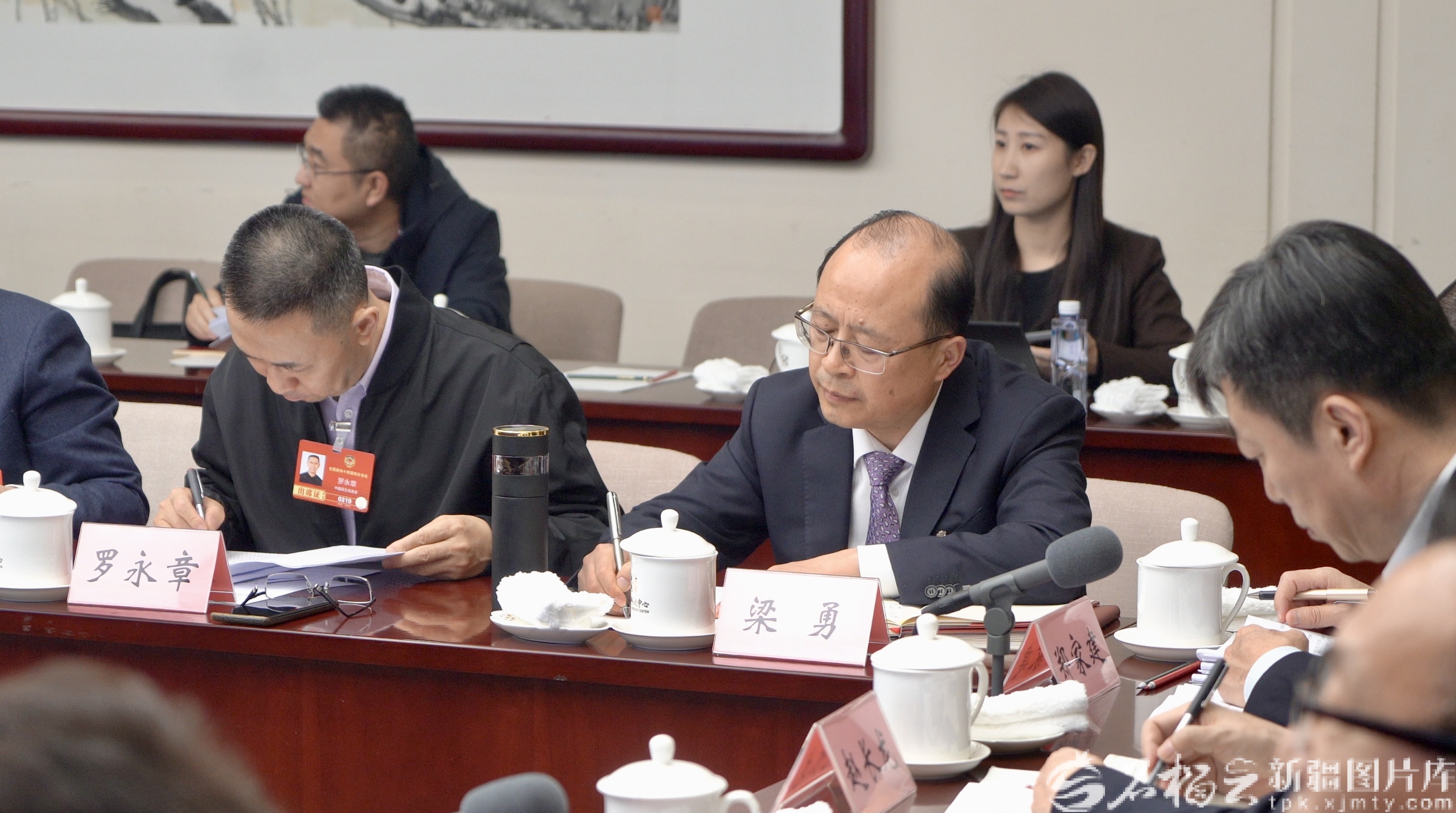 3月5日下午,出席全国政协十四届四次会议的住疆全国政协委员在各界别小组审议政协常委会工作报告和提案工作情况报告。图为梁勇委员认真记录其他委员发言。石榴云/新疆日报记者 王昕摄