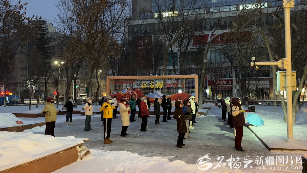 3月1日,乌鲁木齐飘着小雪。张阿姨和姐妹们依旧如约来到人民广场,音响打开,音乐响起,十来个人站成两排,在薄薄的雪上跳起广场舞。雪落在一位阿姨的绒线帽上,很快就被热气融化了。