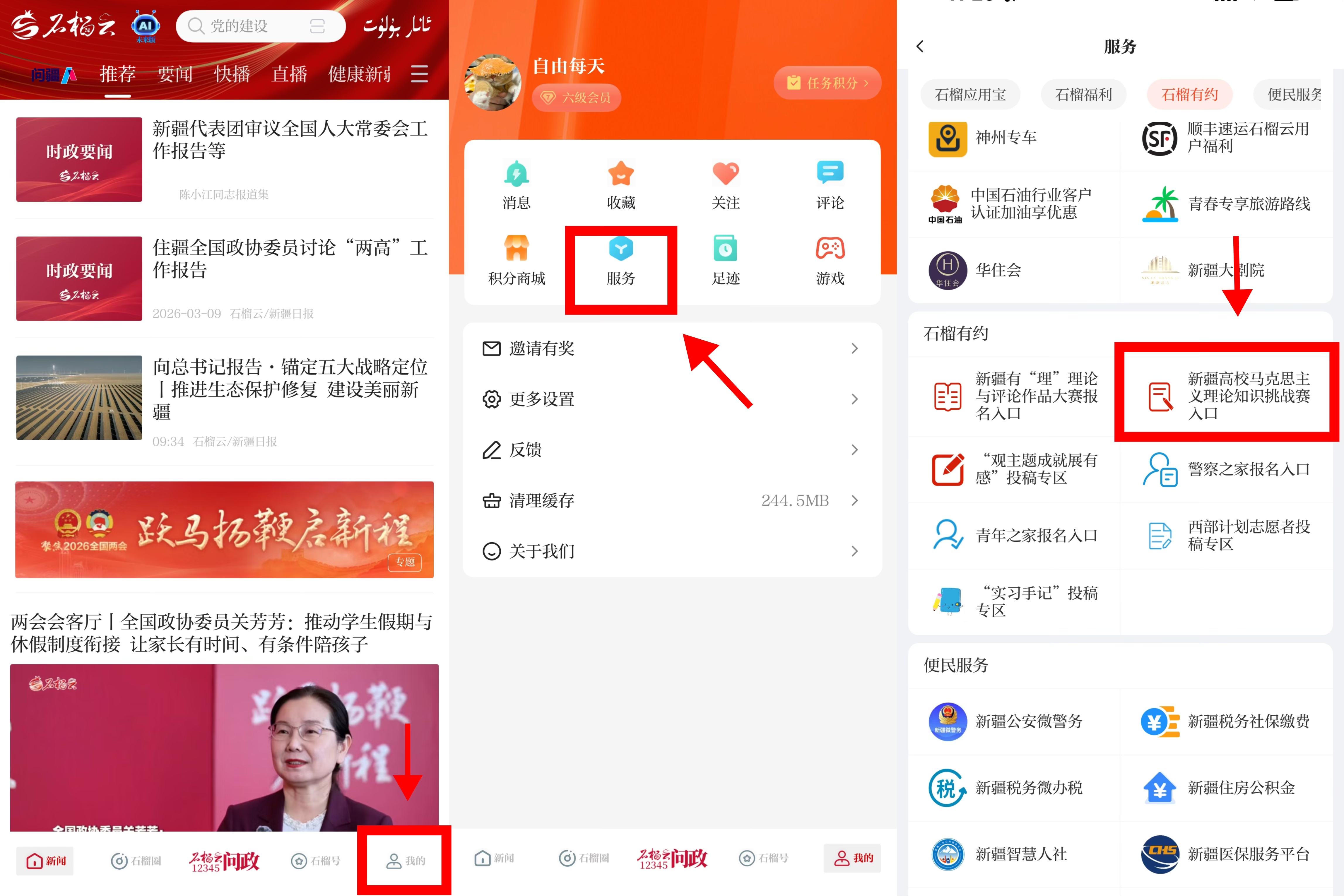 或者点击石榴云客户端右下角“我的”,进入“服务”板块,随后下拉页面,在“石榴有约”找到新疆高校马克思主义理论知识挑战赛入口。