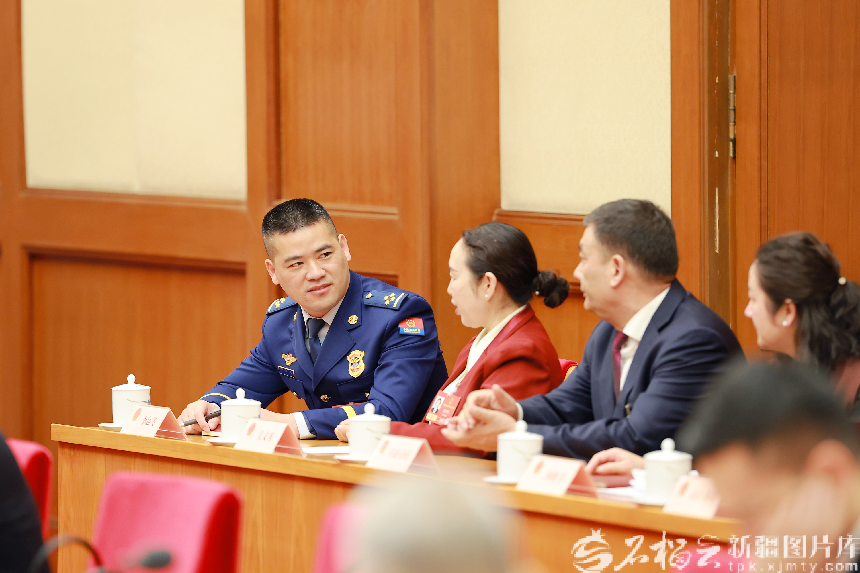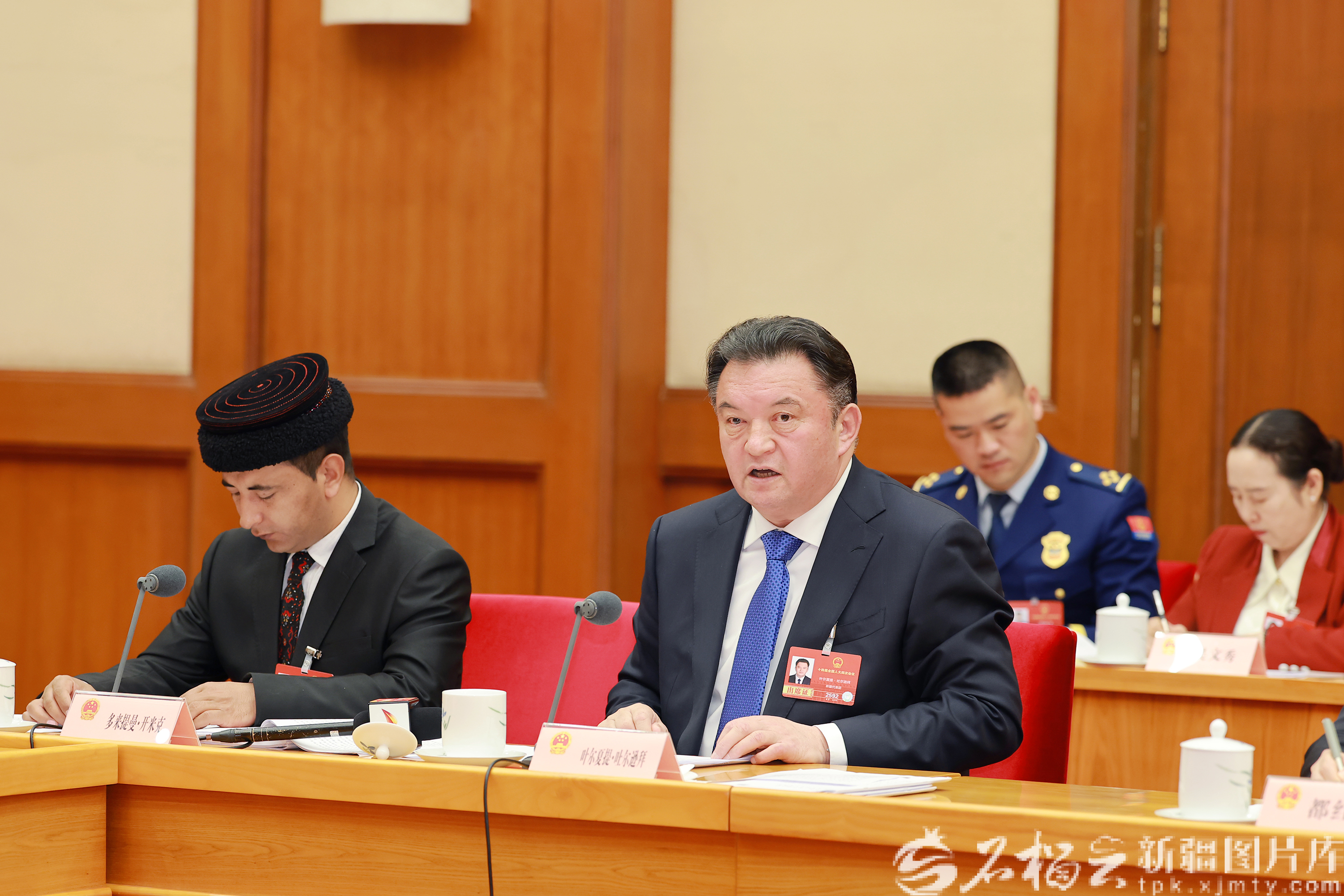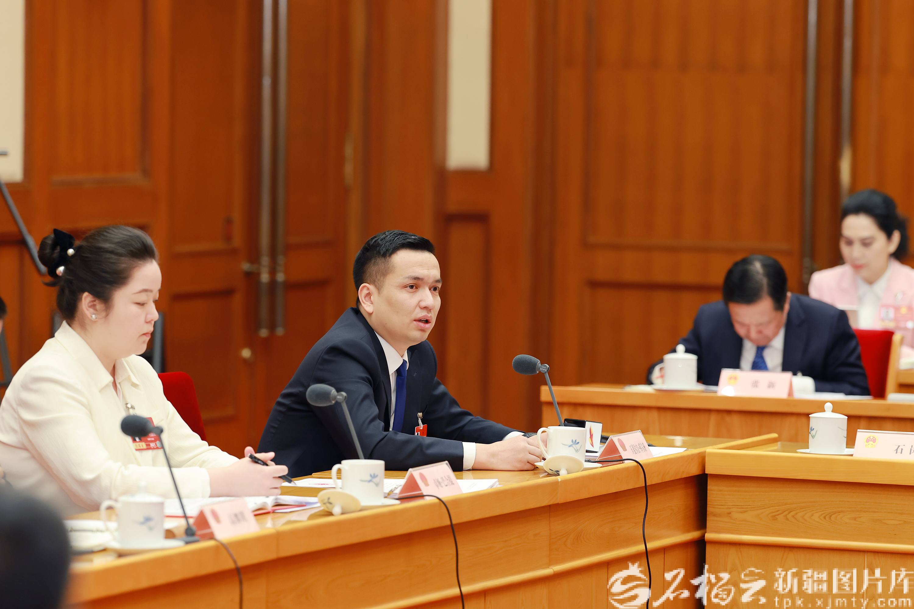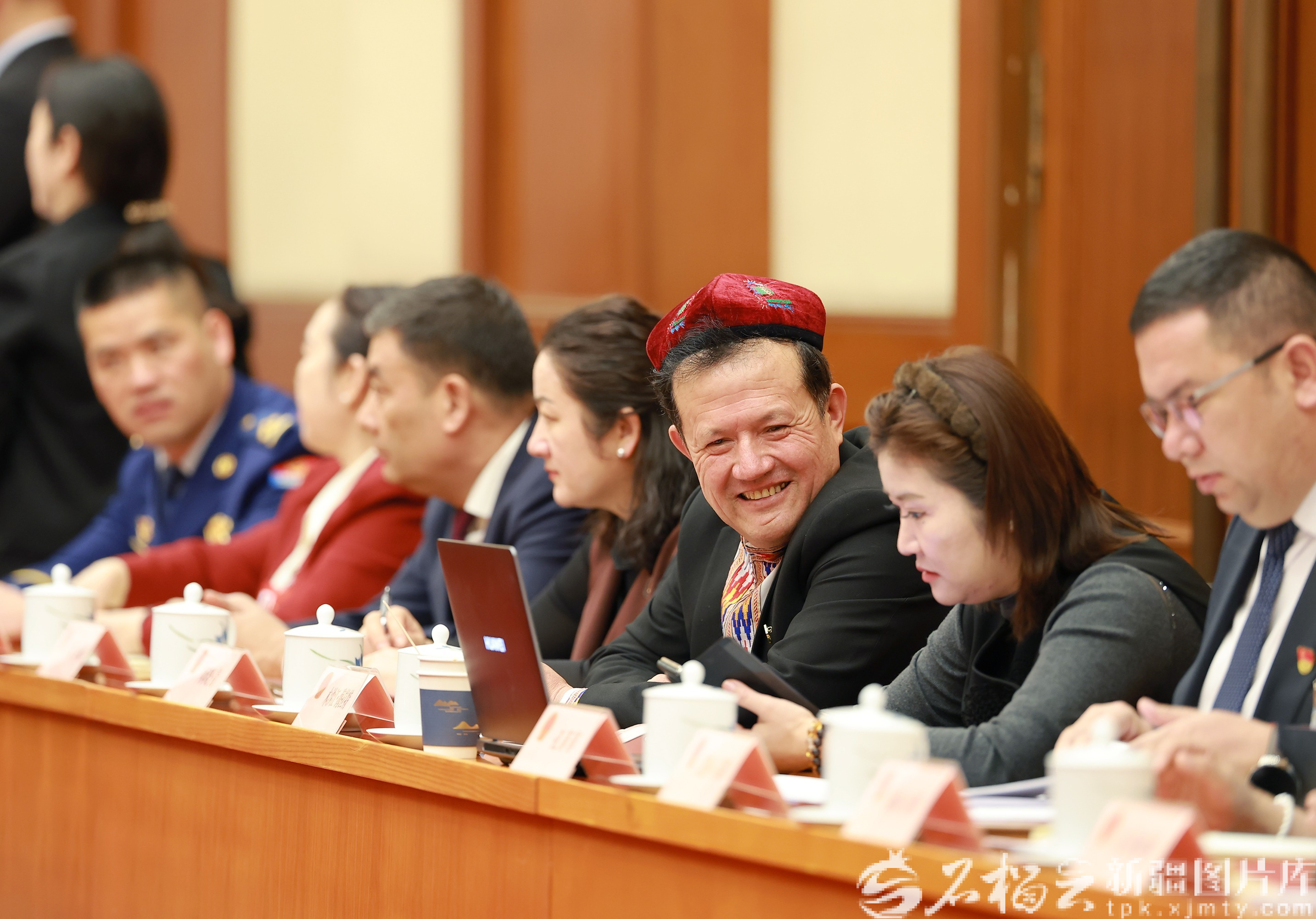 3月11日上午,十四届全国人大四次会议新疆代表团举行全体会议,继续审议全国人大常委会工作报告和最高人民法院工作报告、最高人民检察院工作报告。图为叶尔夏提·吐尔逊拜代表(前排右)在发言时就加快铸牢中华民族共同体意识相关立法、健全配套制度等方面提出建议。石榴云/新疆日报记者 崔志坚摄