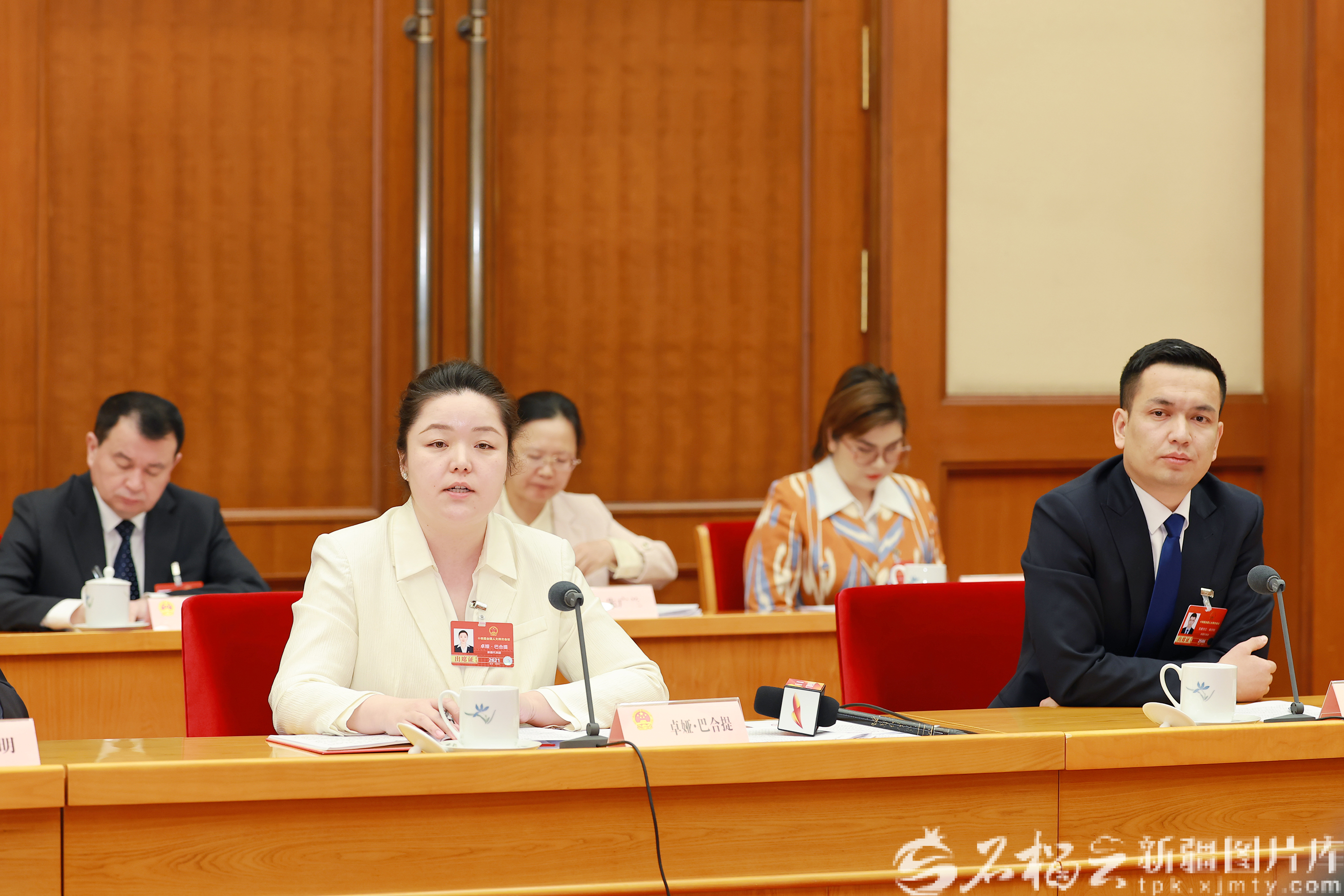 3月11日上午,十四届全国人大四次会议新疆代表团举行全体会议,继续审议全国人大常委会工作报告和最高人民法院工作报告、最高人民检察院工作报告。图为卓娅·巴合提代表(前排左)在发言时就继续深入挖掘、总结、推广中华优秀传统法律文化等方面提出建议。石榴云/新疆日报记者 崔志坚摄