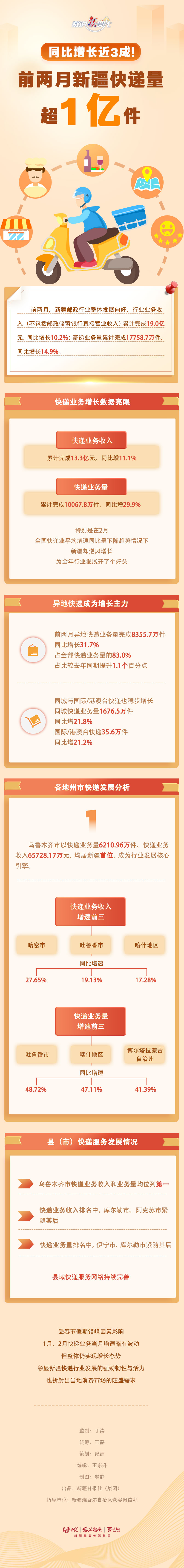 数据显示,前两月新疆快递量超1亿件,同比增长29.9%,迎来今年“开门红”。增长主力是哪个业务?哪几个地州市发展迅速?今天的数说“新”变化一起来了解。
