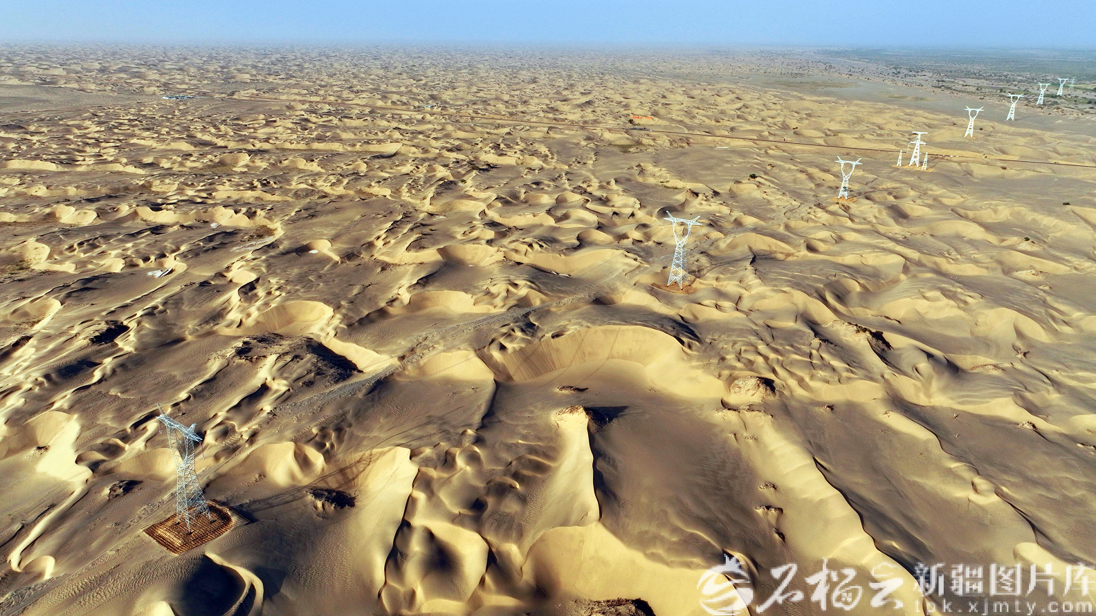 2025年6月25日,和田—民丰—且末—若羌一回750千伏输变电工程穿越塔克拉玛干沙漠。马元 摄