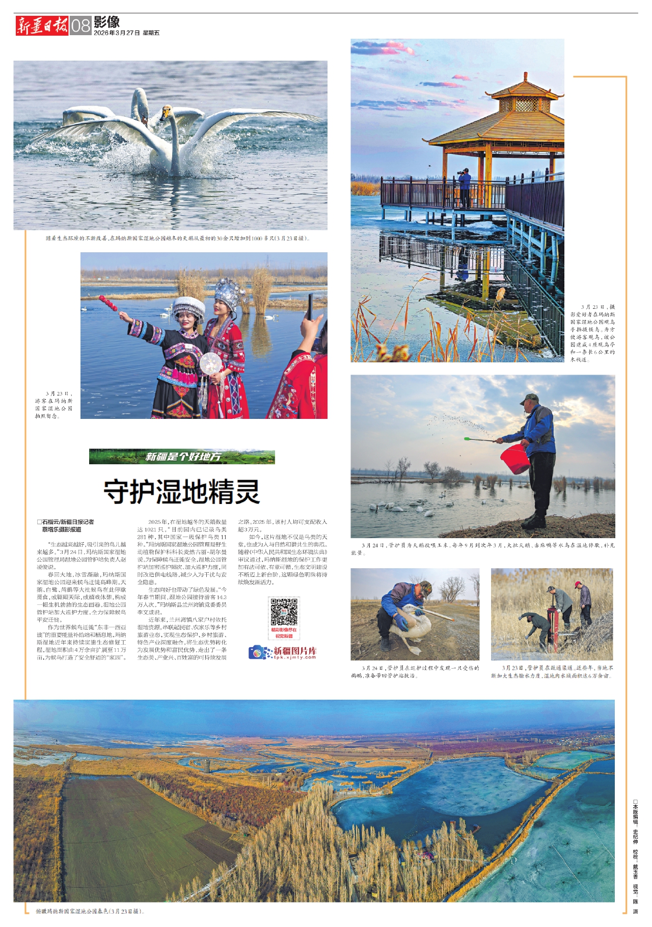 3月24日,管护员为天鹅投喂玉米。每年9月到次年3月,大批天鹅、赤麻鸭等水鸟在湿地停歇,补充能量。