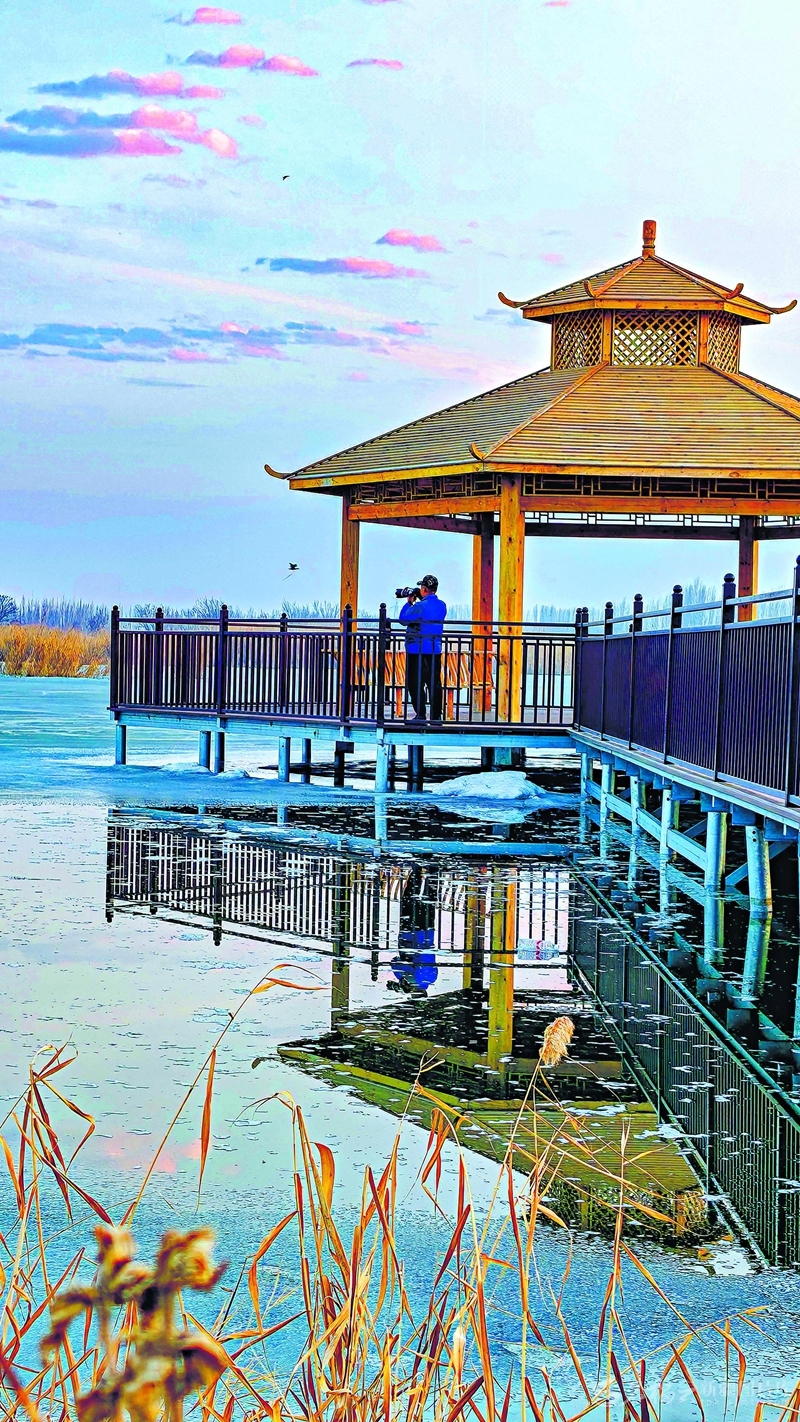 3月23日,摄影爱好者在玛纳斯国家湿地公园观鸟亭拍摄候鸟。为方便游客观鸟,该公园建成4座观鸟亭和一条长6公里的木栈道。