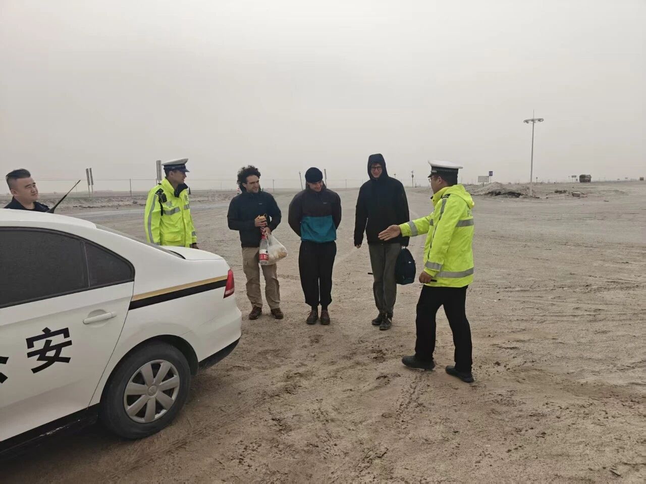 3月25日13时许,若羌县公安局交通管理大队民警在315国道,发现3名徒步前行的外籍人员,彼时辖区正遭遇强沙尘恶劣天气,漫天沙尘导致道路能见度极低,路面通行条件极差,3人徒步滞留路边,处境十分危险。民警见状立即上前询问是否遇到困难。