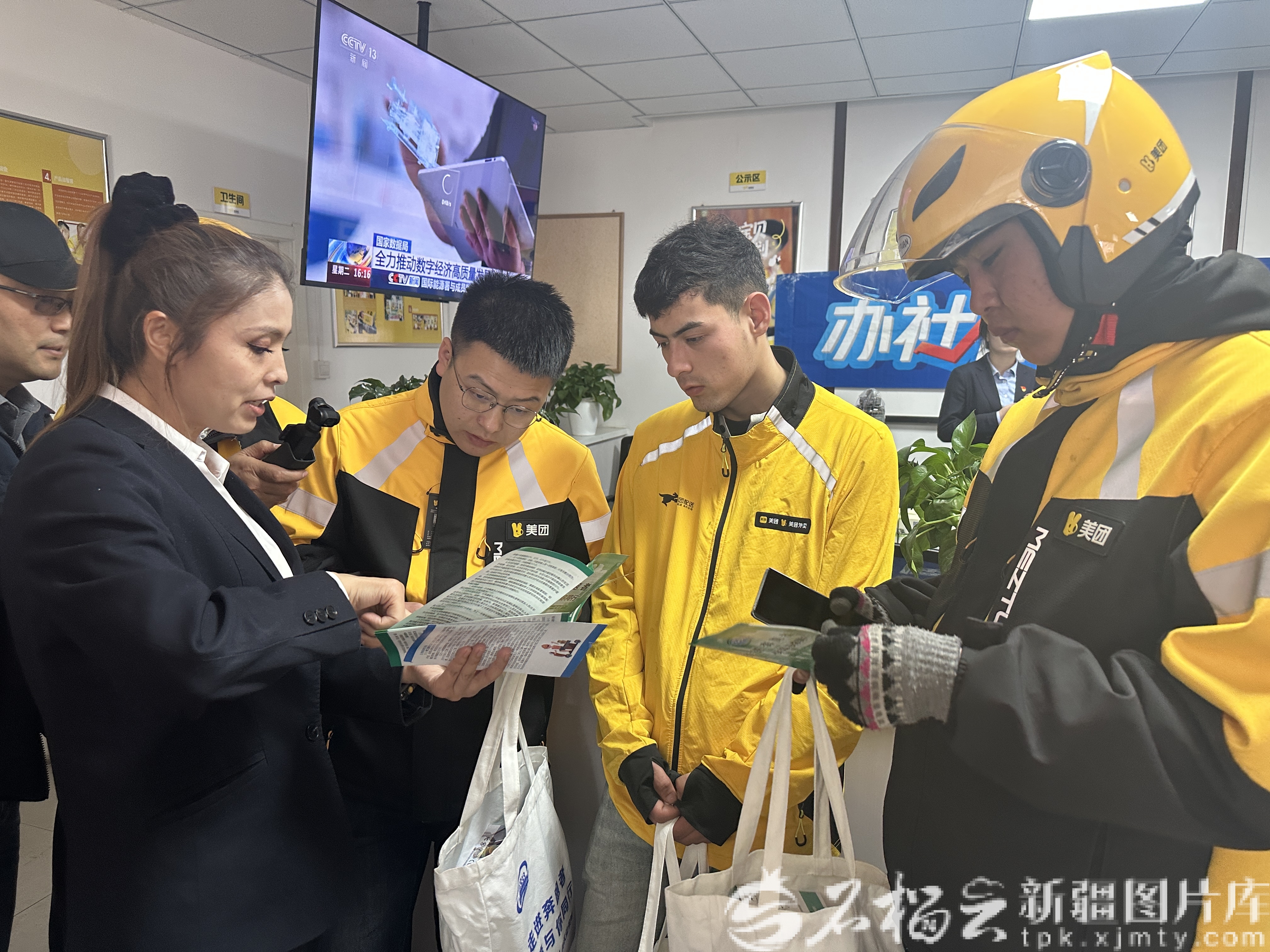 3月27日,由自治区人力资源和社会保障厅、新疆生产建设兵团人力资源和社会保障局联合组织的“12333统一咨询日”活动,走进外卖、快递网点,向骑手、快递员面对面宣传新就业形态人员职业伤害保障试点相关政策。石榴云/新疆日报记者 赵春华摄