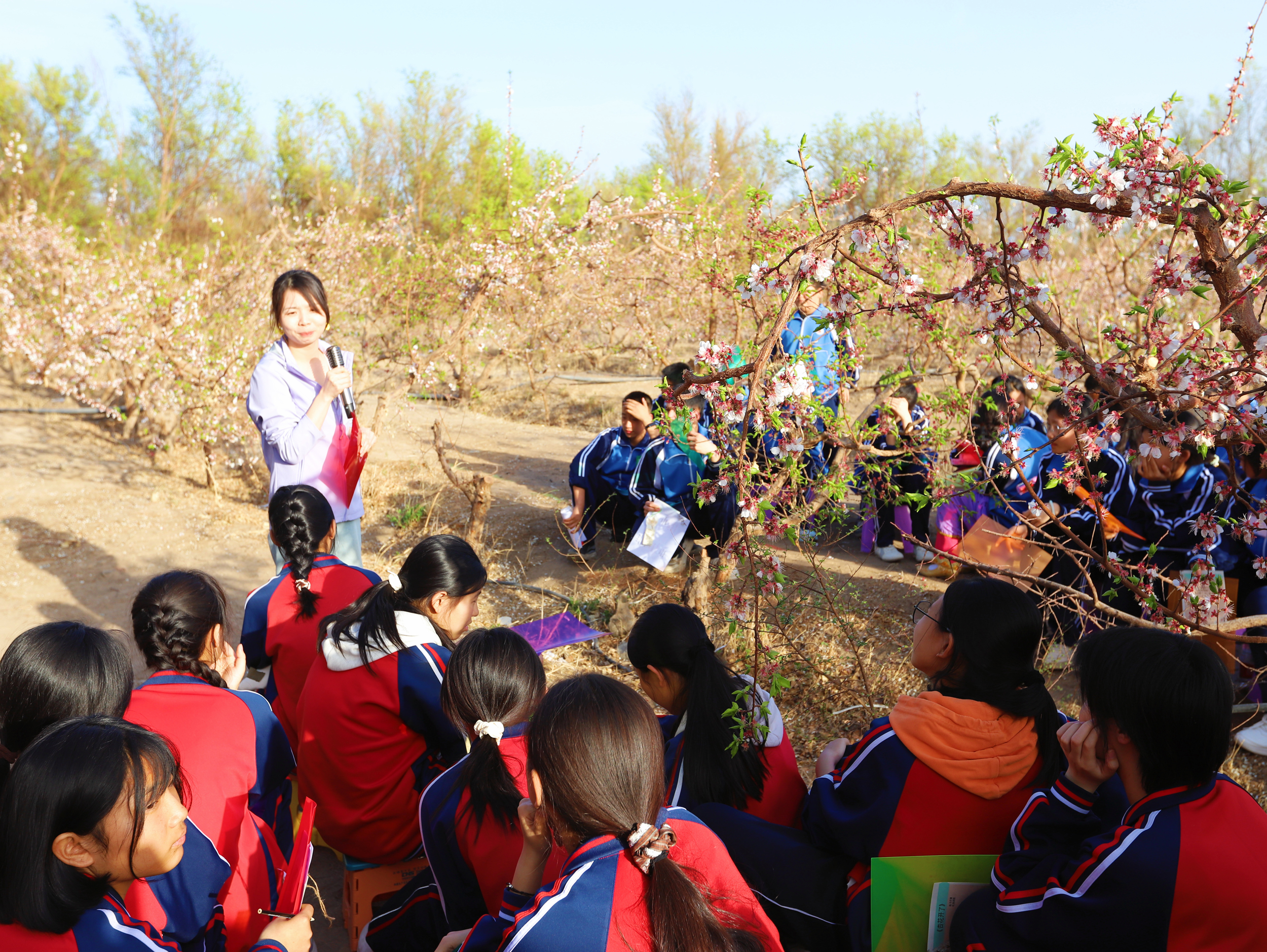 3月30日,吐鲁番市高昌区第一中学、第四中学与兵团第十二师二二一团学校联合开展“杏绘火洲 湘遇疆来”主题研学实践活动。50余名兵地师生通过跨学科融合教育,在探寻红色记忆与自然之美中深化民族团结认知。图为教师向学生讲解杏花知识。(吐鲁番市融媒体中心供图)