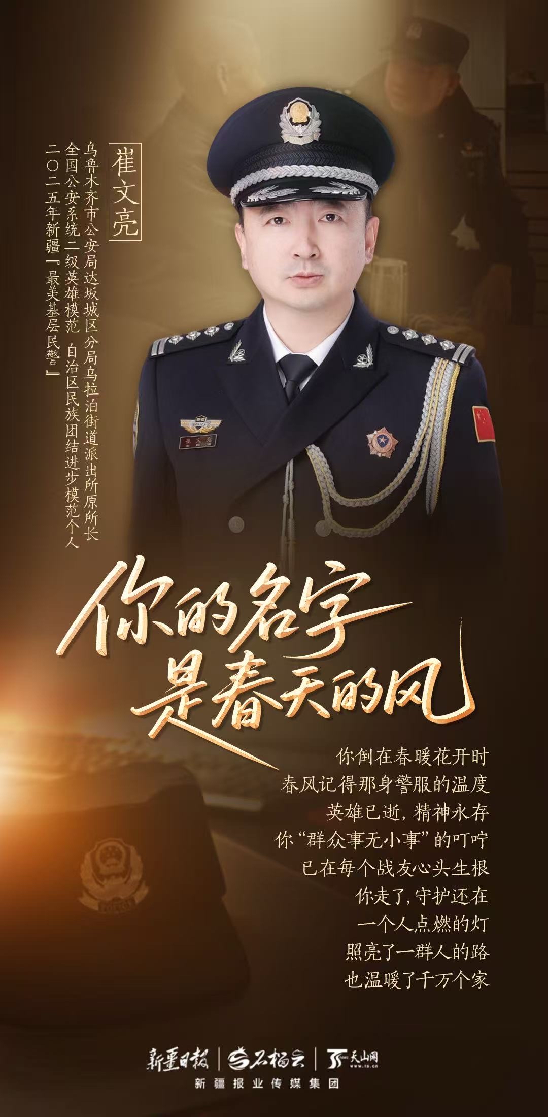 2025年3月18日,乌鲁木齐市公安局达坂城区分局乌拉泊街道派出所所长崔文亮因突发疾病,倒在他挚爱了26年的公安工作岗位上。