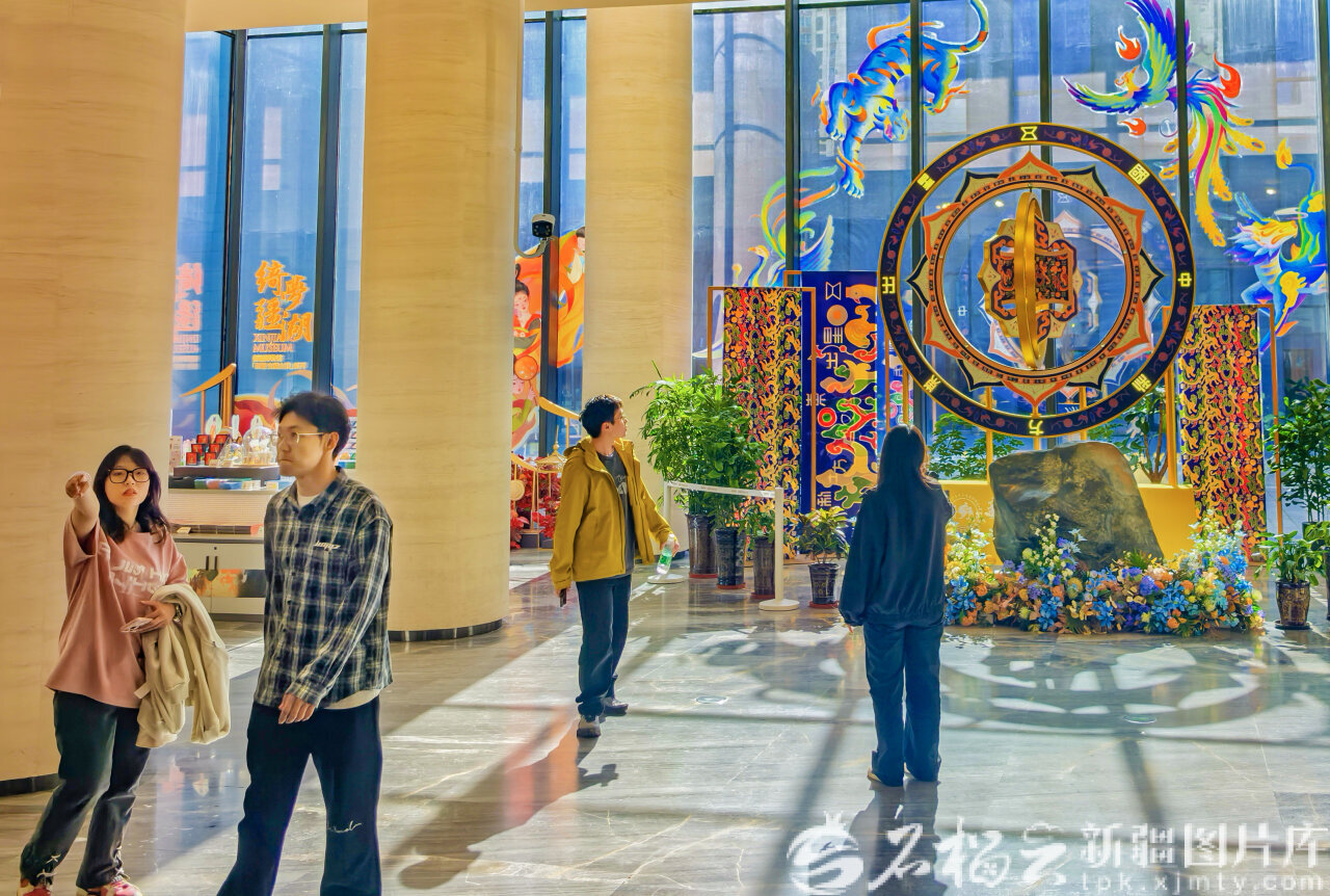 4月6日,新疆博物馆“五星出东方利中国”巨型轮盘造型的艺术装置气势恢宏,背景窗棂上的龙凤彩绘寓意吉祥,成为清明假期市民、游客参观的热门打卡点。