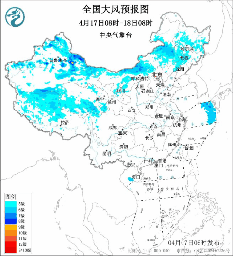 4月17日8时至19日8时全国大风预报图。图/中央气象台