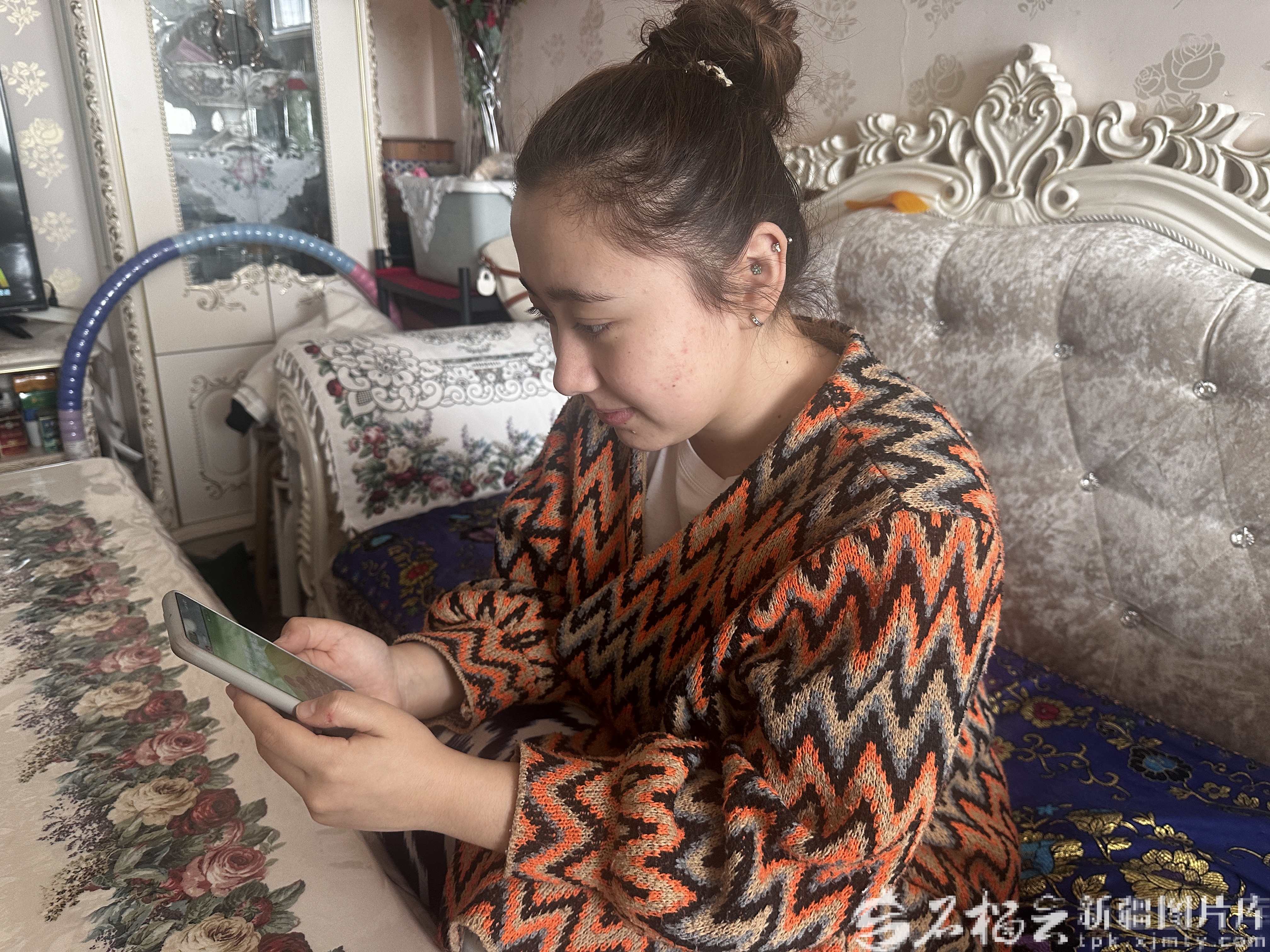 4月15日,乌鲁木齐市水磨沟区振安街街道春祥社区居民仙依旦·阿克拜尔观看《小振邻里》视频。天山网-新疆日报记者 魏红萍摄