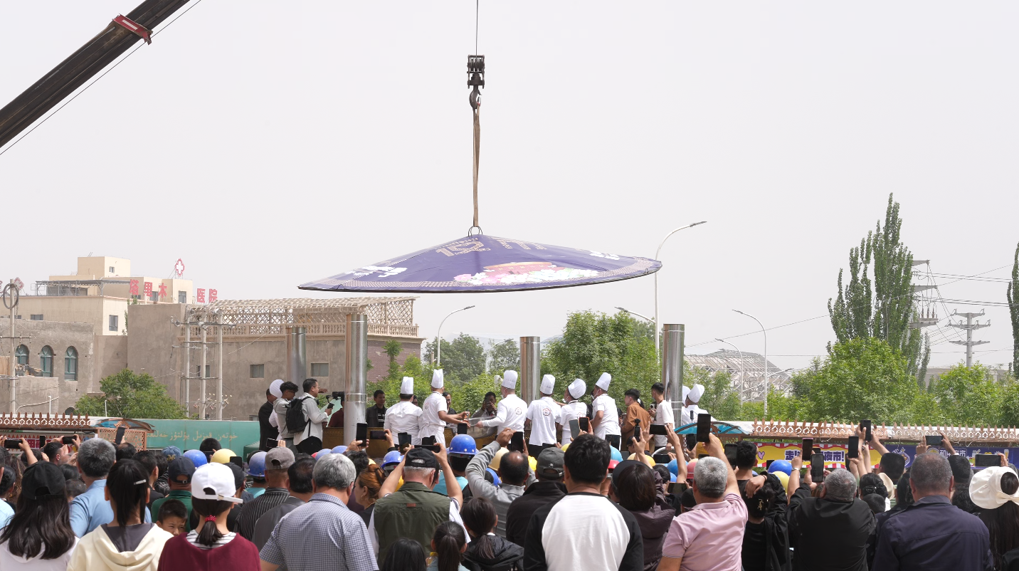 亮相的“新疆第一锅”直径达6米,深1.3米,周长18.8米,单次最大可制作2万份抓饭。当天清晨7时,20余名厨师就开始准备食材,历经7小时炖煮,抓饭出炉。