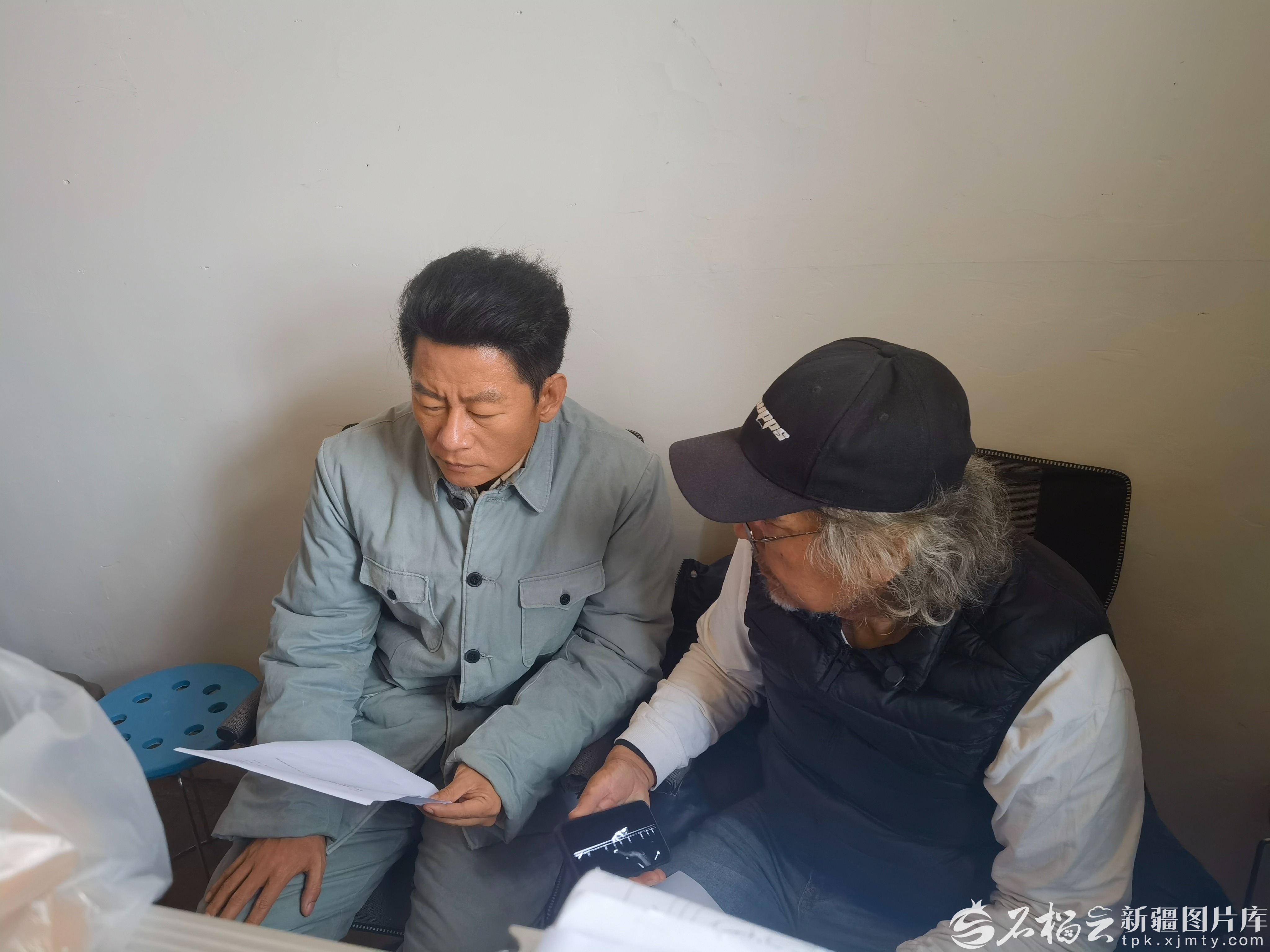电影《万桐书》拍摄中导演西尔扎提•牙合甫(右)与万桐书的扮演者李健讨论情节。天山网-新疆日报记者 银璐摄