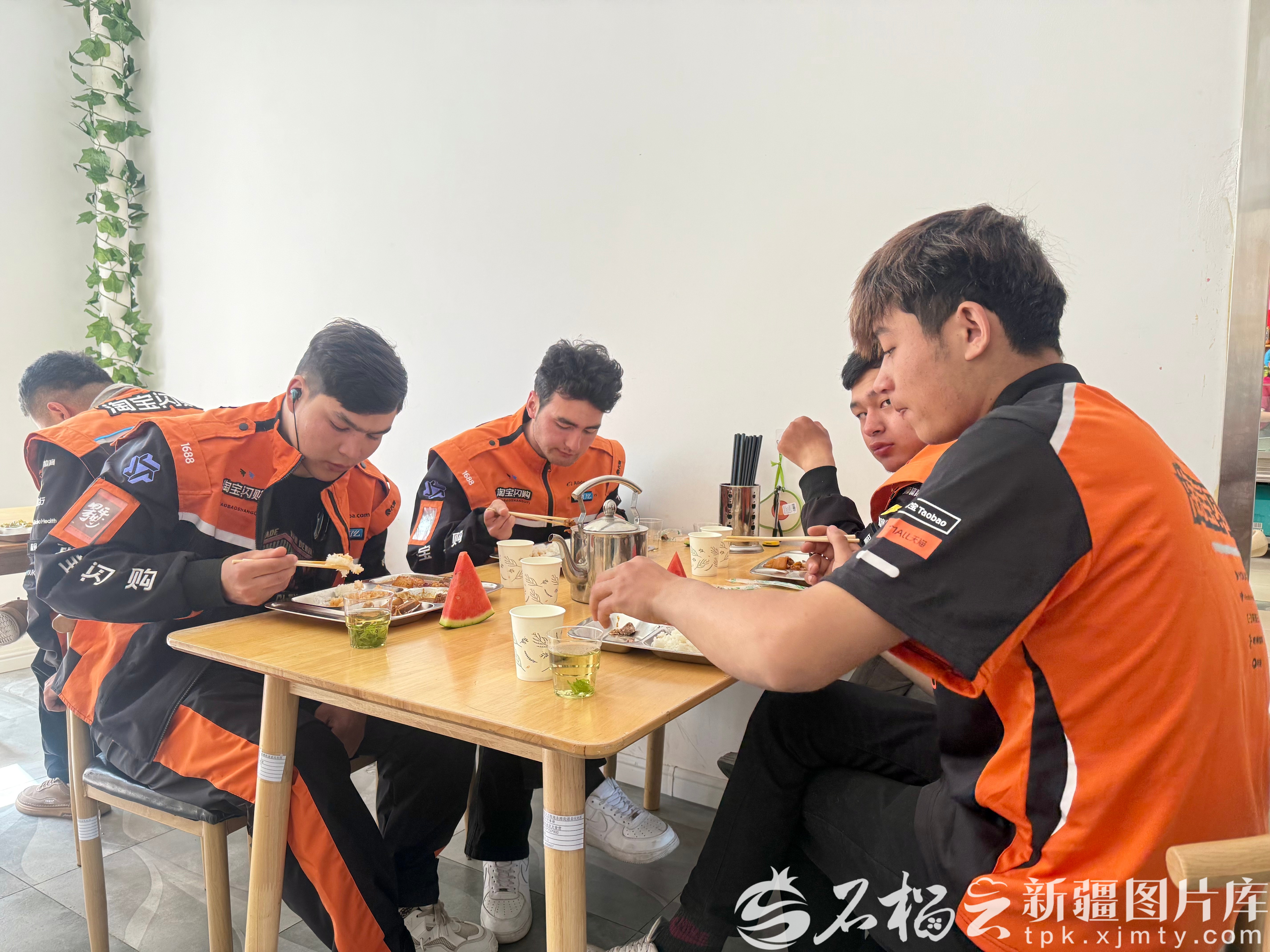 4月17日,乌鲁木齐市米东区古牧地东路街道益民社区助餐大食堂,忙完了早上的订餐配送,“淘宝闪购”小哥们扎堆来吃饭。石榴云/新疆日报记者 郭倩 摄