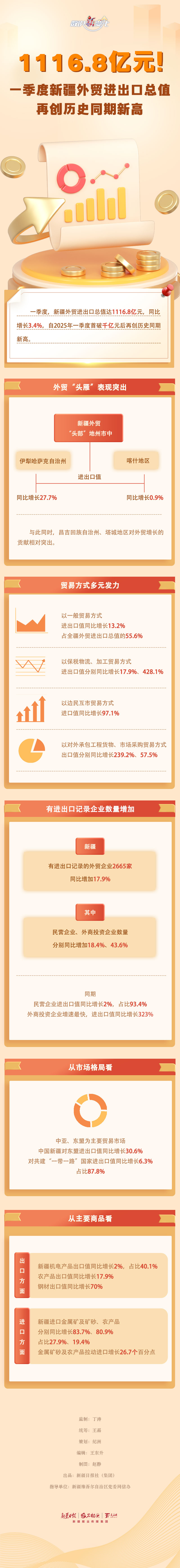面对错综复杂的外贸内外部发展环境,新疆采取积极措施,全力保障外贸发展,取得积极成效。一季度,新疆外贸进出口总值达1116.8亿元,同比增长3.4%。这一优异成绩是如何取得的?哪些地州对外贸增长的贡献突出?今天的《数说“新”变化》一起来看看。