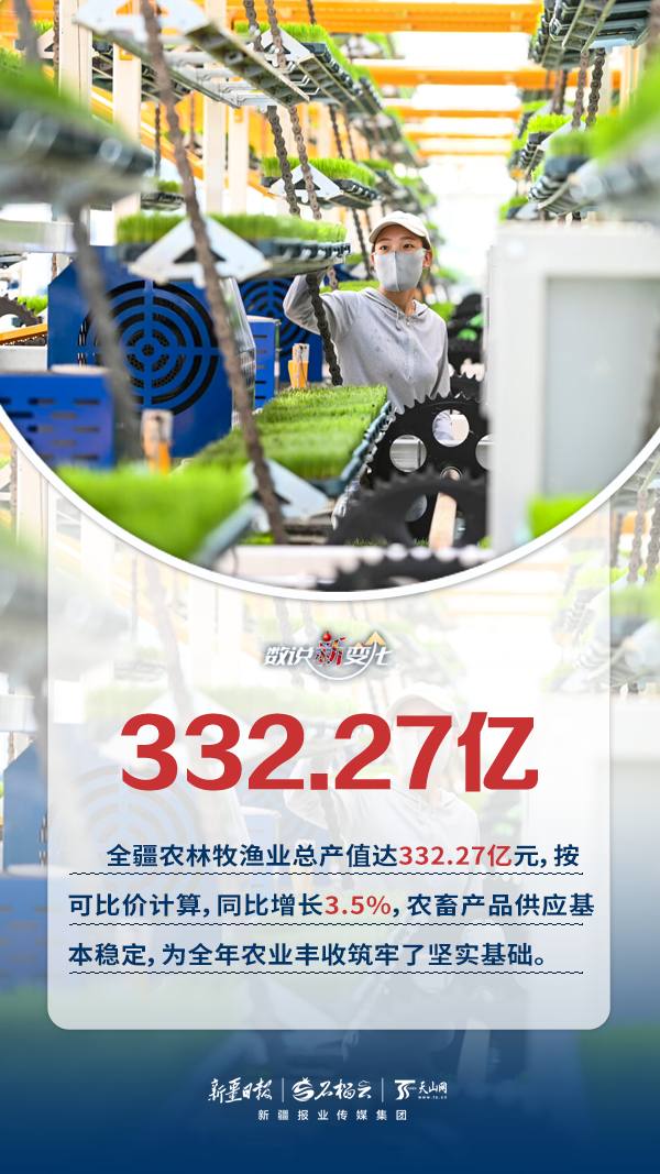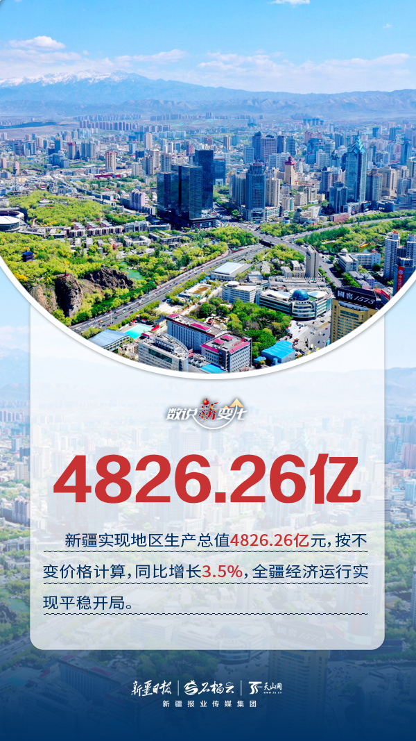 一季度,新疆实现地区生产总值4826.26亿元,按不变价格计算,同比增长3.5%。第一产业增加值154.54亿元,同比增长3%;第二产业增加值1891.64亿元,同比增长5.2%;第三产业增加值2780.08亿元,同比增长2.3%,全疆经济运行实现平稳开局。本期《数说“新”变化》将通过一组海报,带您直观了解一季度新疆经济发展的主要成就。