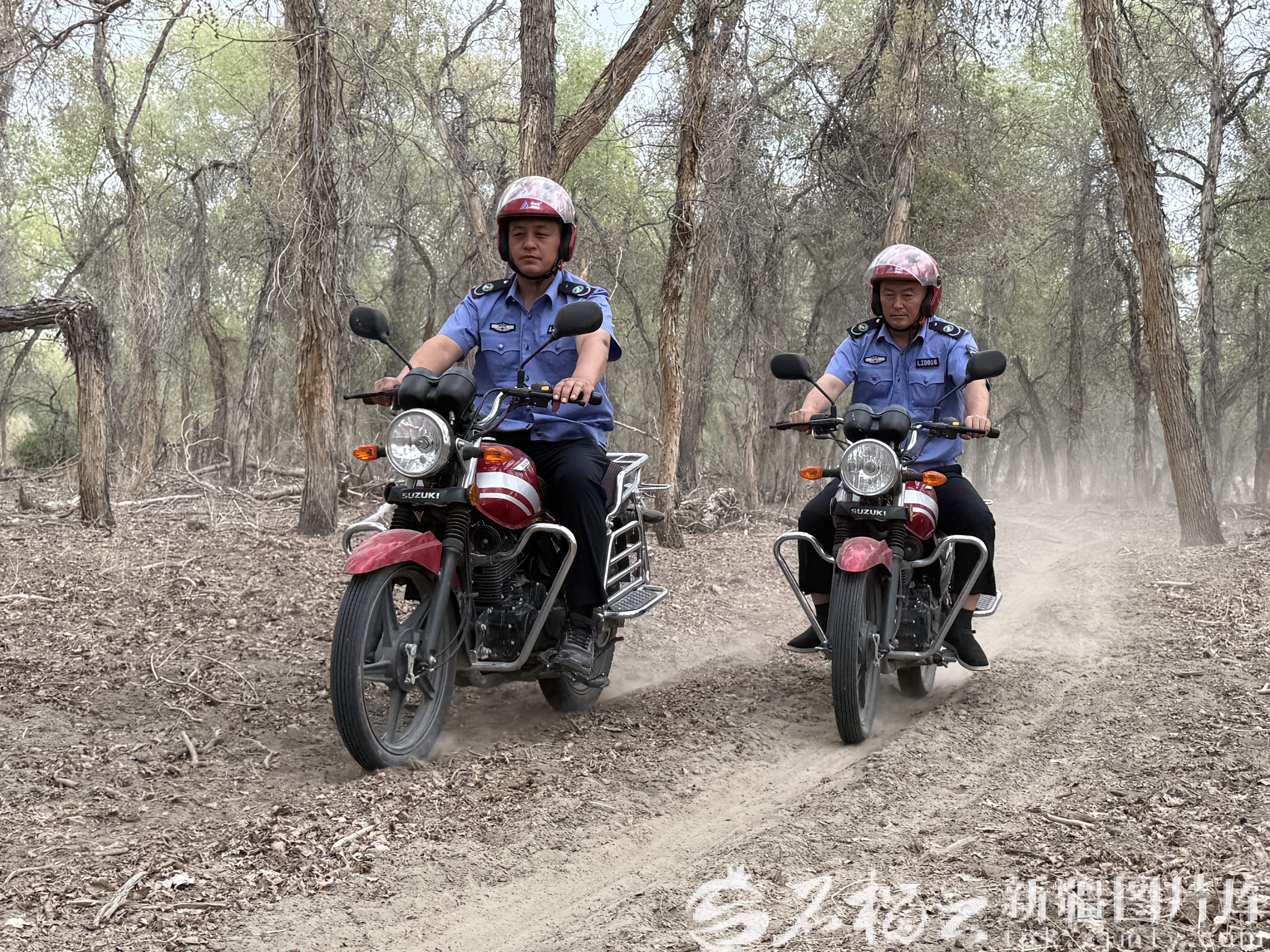 4月23日,拜铁木尔·吾木汗(左)和同事骑摩托车巡护。石榴云/新疆日报记者 白素君摄