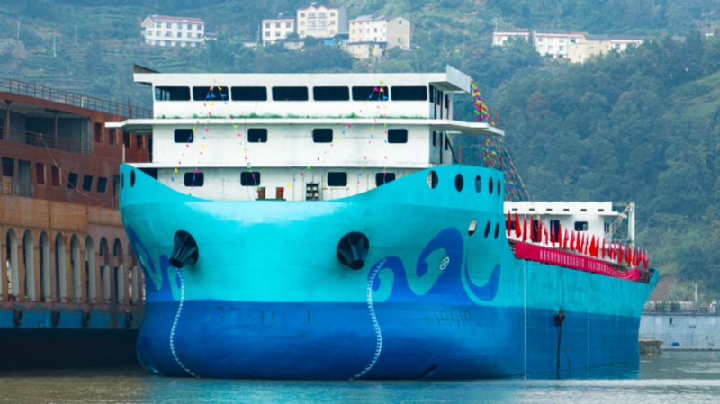 万吨级纯电动散货船在湖北宜昌下水舾装