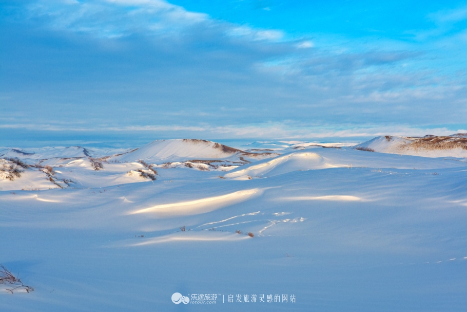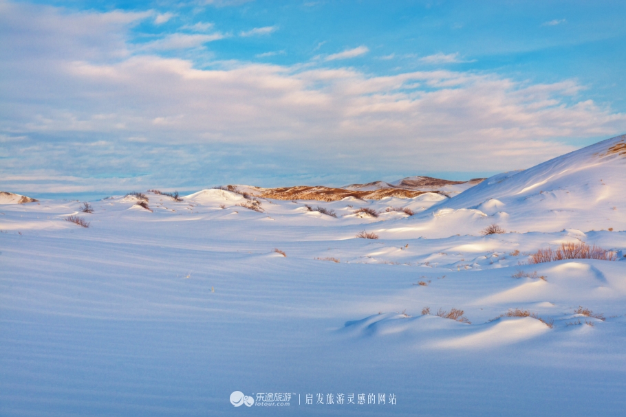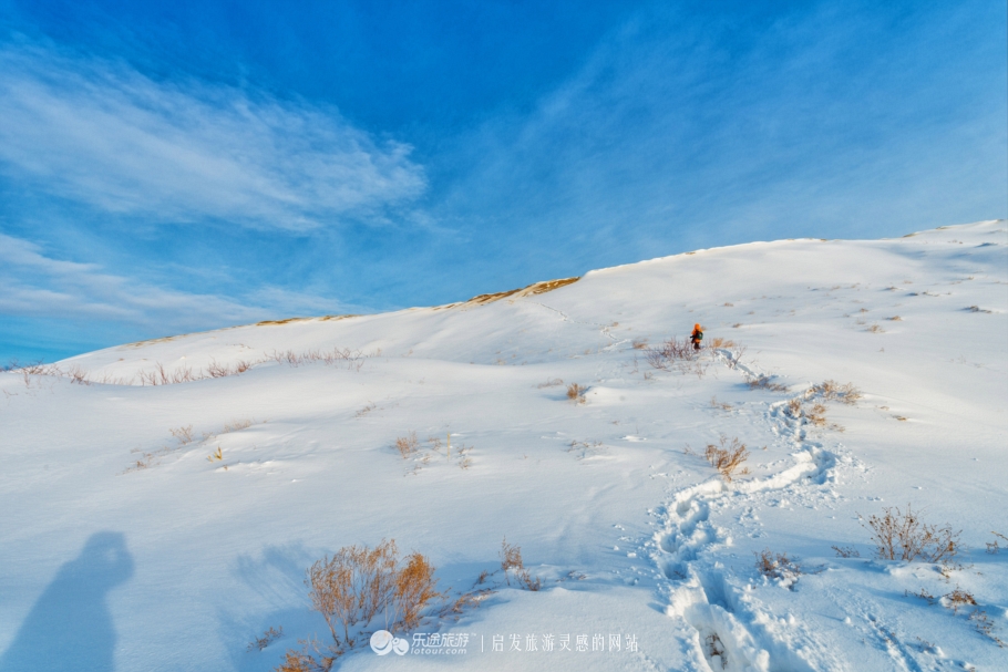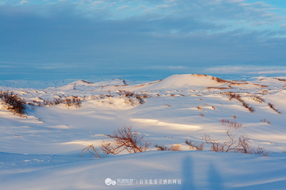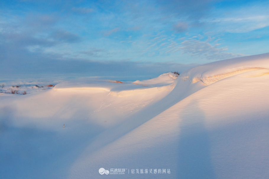 沙漠中的风也来的猛烈,偶尔夹杂着从沙丘上裹挟来的雪片呼呼从耳畔吹过。沙地上的落雪足足有半米深,一脚踏进去立马没过了膝盖。也许正是因为雪下的深,反而模糊了沙丘间原本线条分明的脊线,将一座座沙岗连成一片。行走其中,满目除了壮阔的白色沙山,就是斜挂在天边的夕阳在雪面上浸染出点点金色光芒。