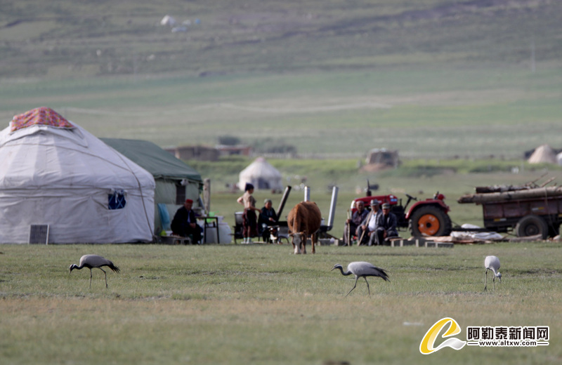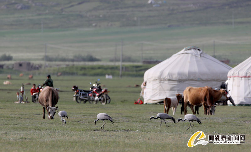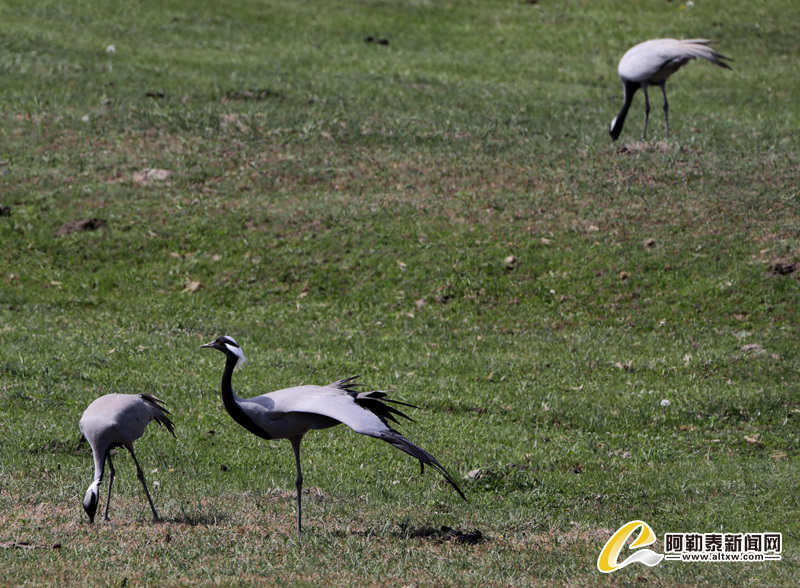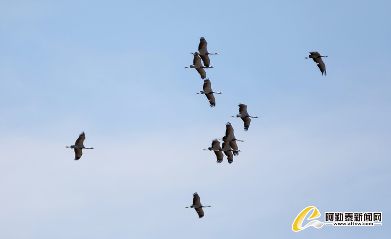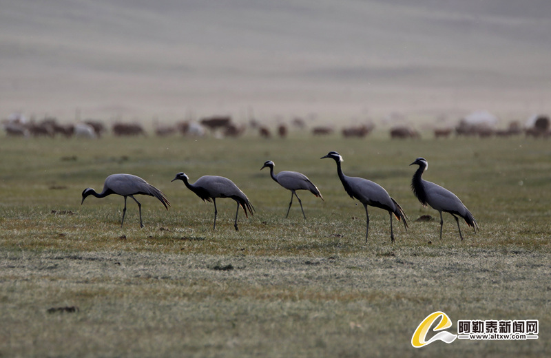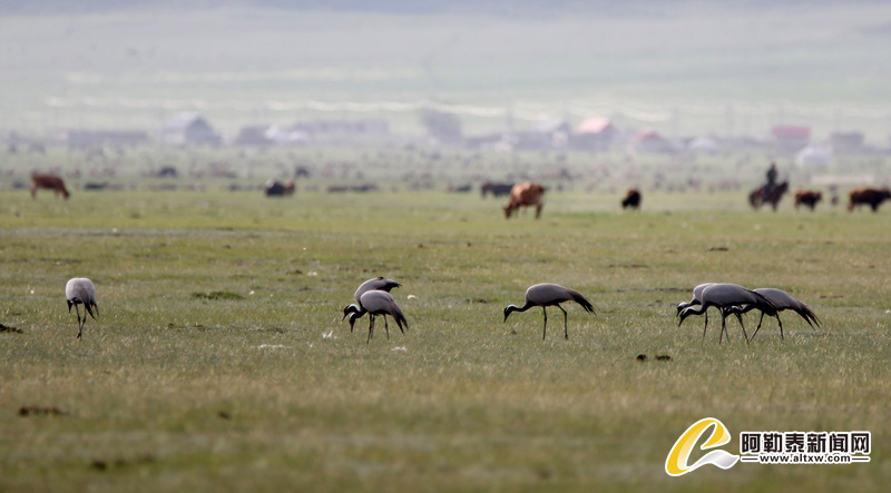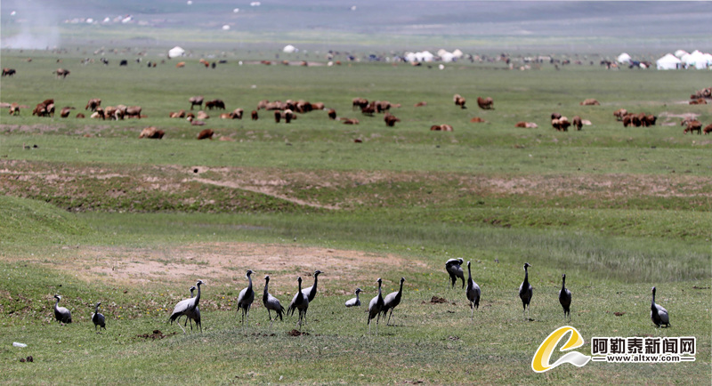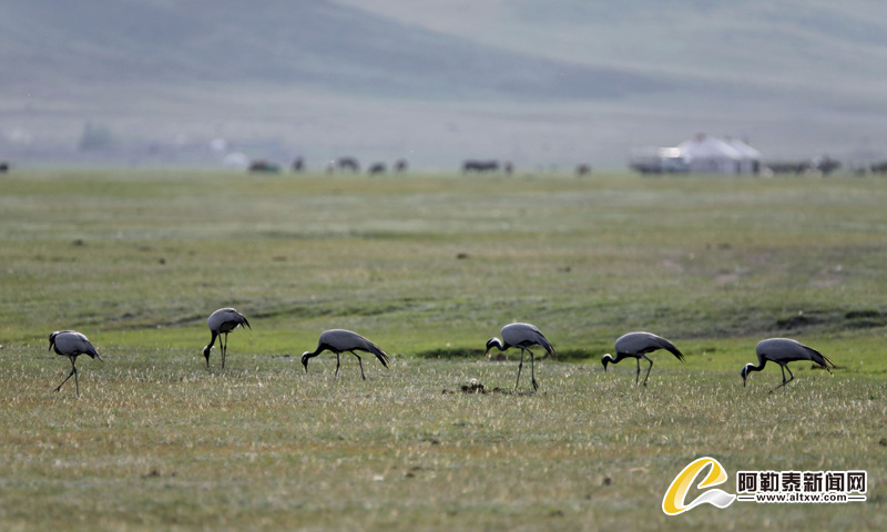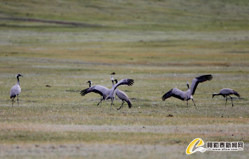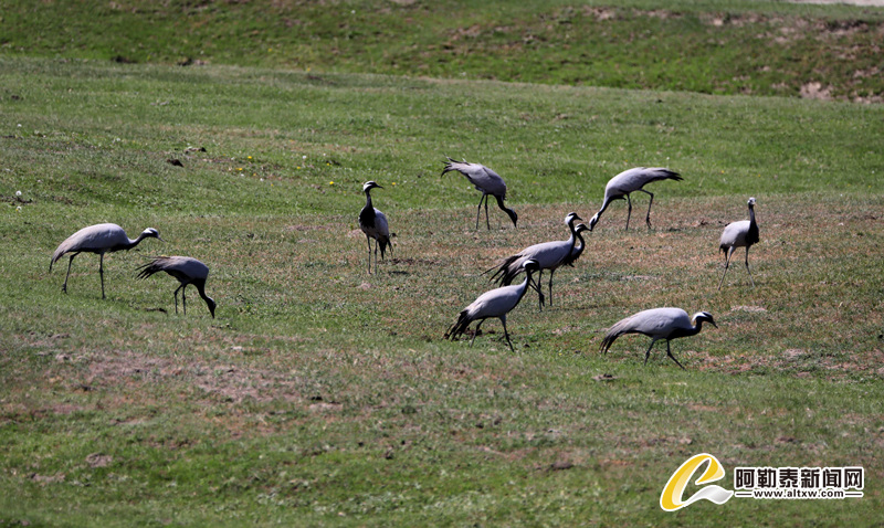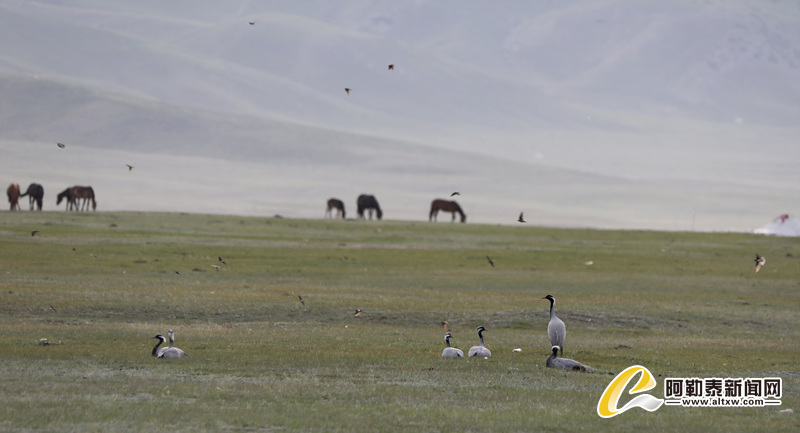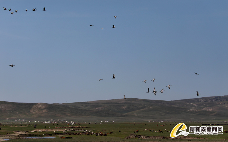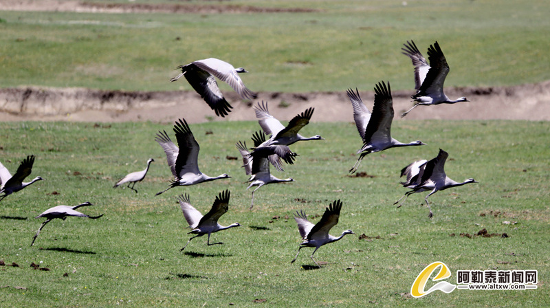 阿勒泰新闻网讯:(通讯员 巴合提别克)6月17日,在新疆阿勒泰地区布尔津县中牧场黑柳滩,大群野生灰鹤在牧场草原上方飞舞,灰压压一大片,十分壮观。