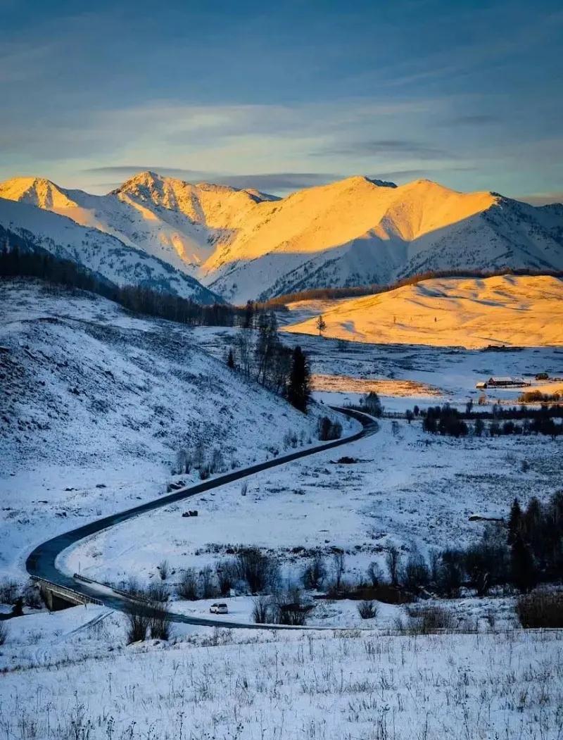百万棵落叶松层层叠叠,寂静而梦幻;一个转弯之后,远山微醺,连时间都被夕阳染成暖洋洋的。