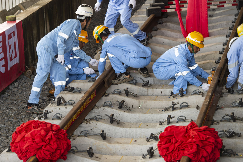 3月31日,在印度尼西亚雅加达雅万高铁哈利姆车站,工人铺设雅万高铁全线最后一根钢轨。
