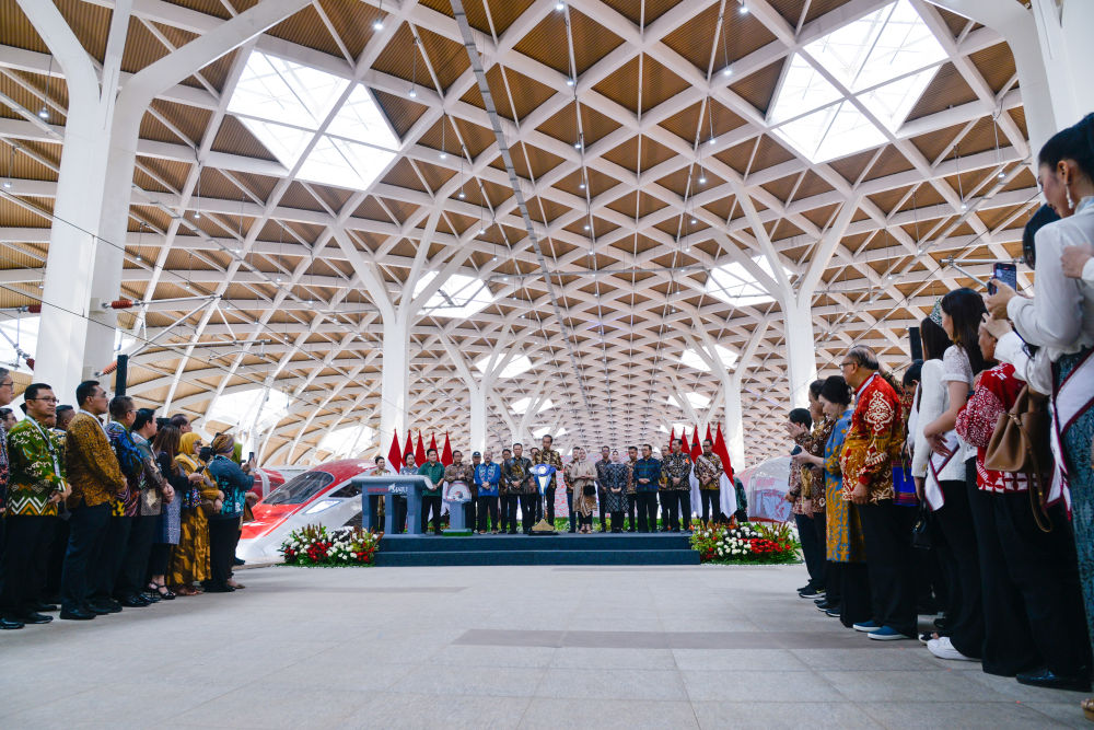 10月2日,在印度尼西亚雅加达哈利姆高铁站,印尼总统佐科(中)在雅万高铁启用仪式上致辞。