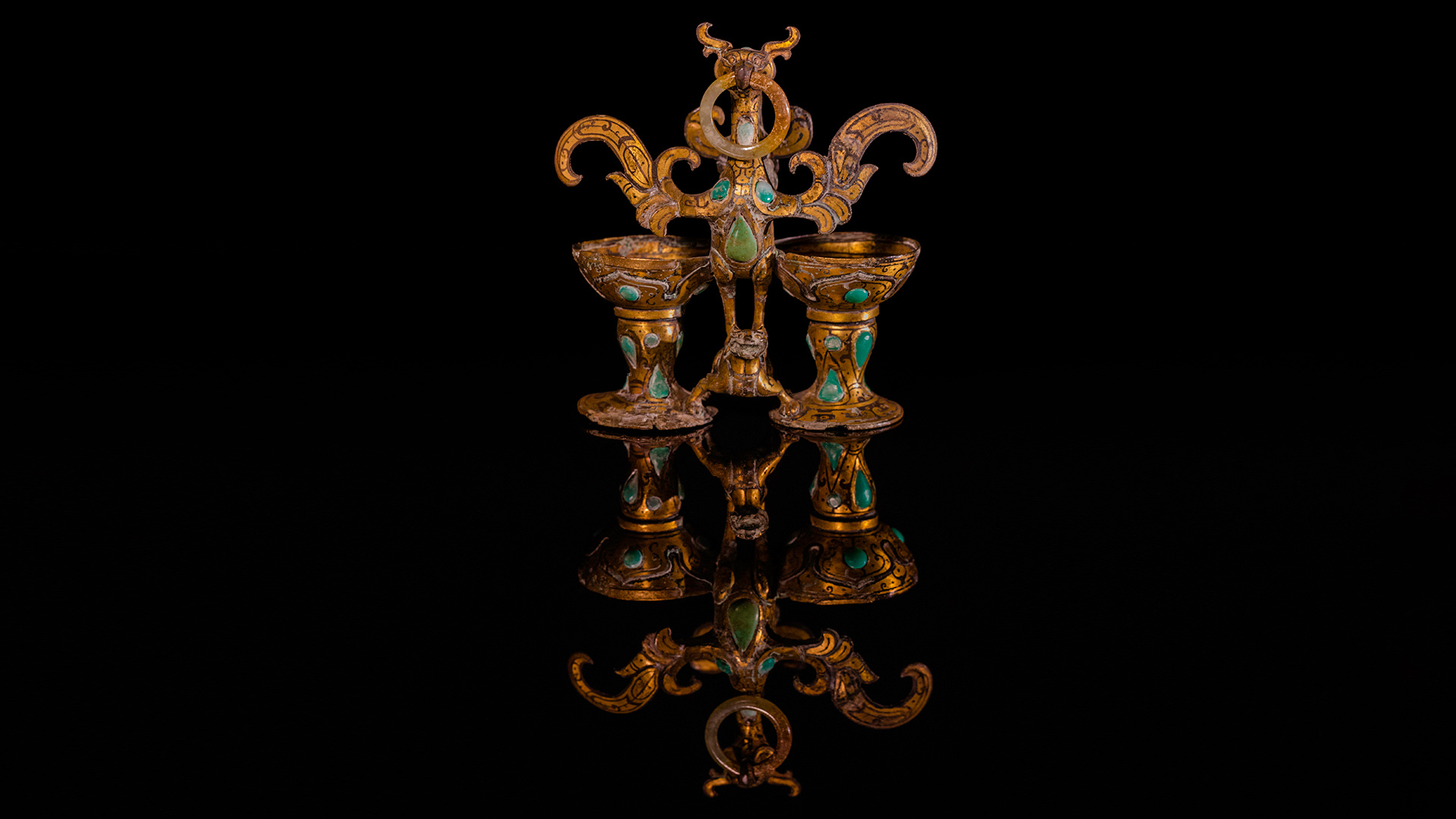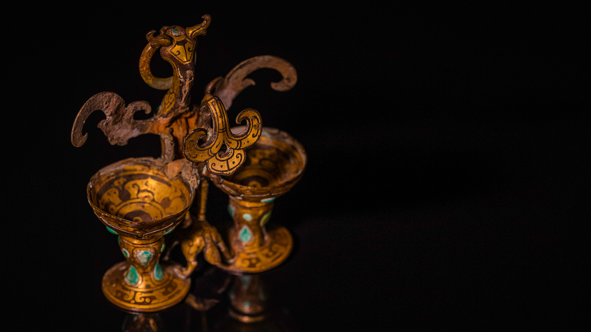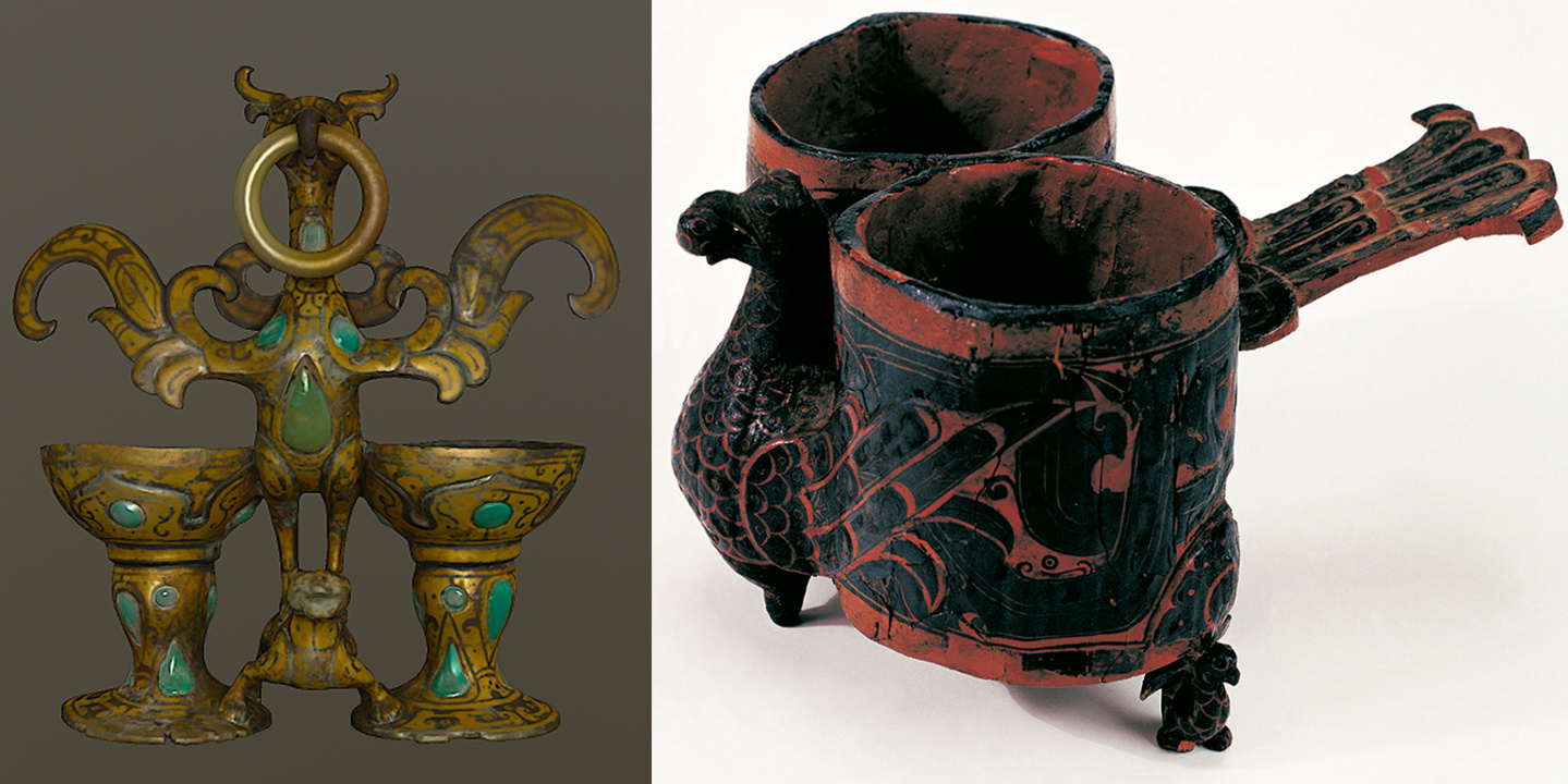 △右为湖北荆门包山楚墓中出土的彩绘凤鸟双连杯,湖北省博物馆藏。