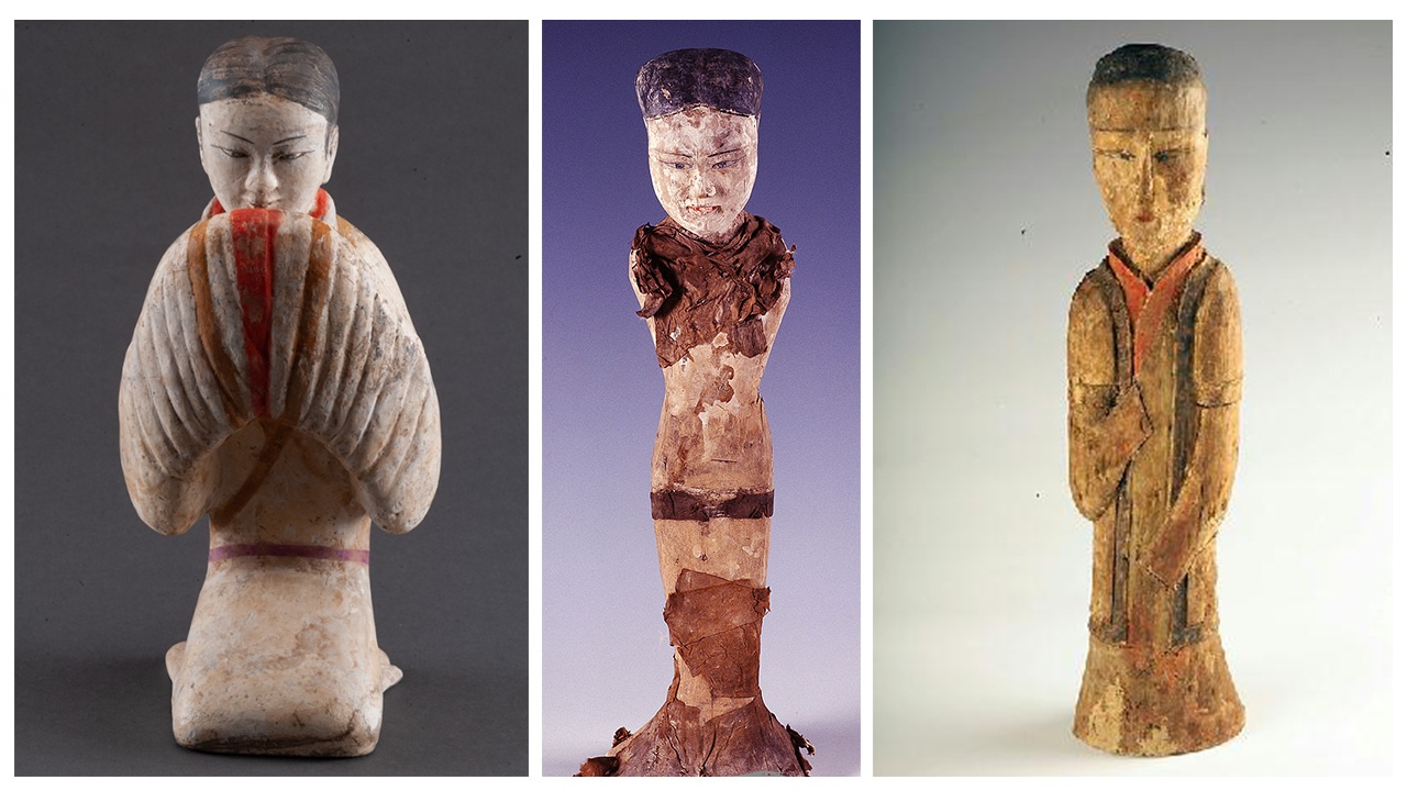 △左:西汉塑衣式彩绘拱手跽(jì)坐女俑,汉景帝阳陵博物院藏。中:西汉着衣歌舞俑,湖南省博物院藏。右:西汉雕衣女侍俑,湖南省博物院藏。