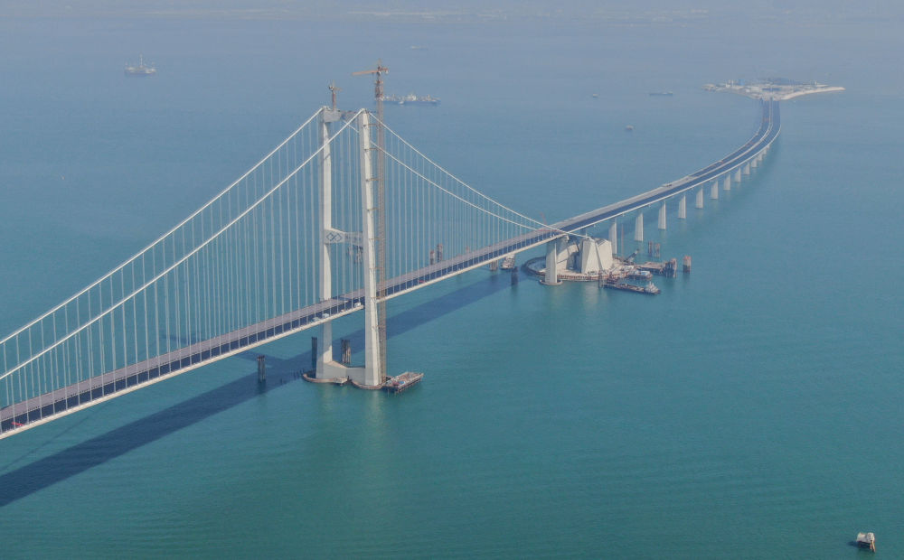 2023年11月28日,粤港澳大湾区超级工程深中通道主线正式贯通,这是深中通道伶仃洋大桥东塔及西人工岛(无人机照片)。新华社记者 邓华 摄