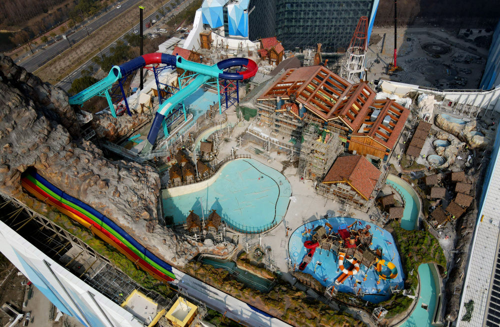 位于上海浦东新区临港新城的耀雪冰雪世界项目建设进入收尾阶段,包括滑雪场和嬉水中心在内的工程施工正在有条不紊的进行中。(1月6日摄,无人机照片)。新华社记者 方喆 摄