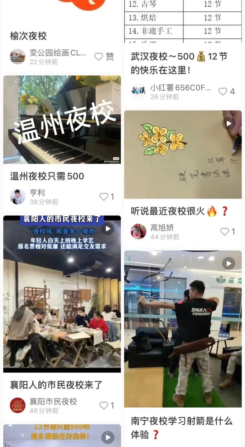夜校正在全国各地开花。据报道,近日,北京正活跃着一批个人创业的夜校项目,单课时价格仅为50元左右,涵盖了咖啡、调酒、乐器、化妆等课程;河北廊坊安次区文化馆,夜幕降临,六楼的电梯门打开,一群年轻人鱼贯而出,奔向舞蹈、古筝、书法等不同教室;晚七点,武汉市汉阳区梅林都汇社区二楼的共享自习室灯火通明,青年们人手一把尤克里里……