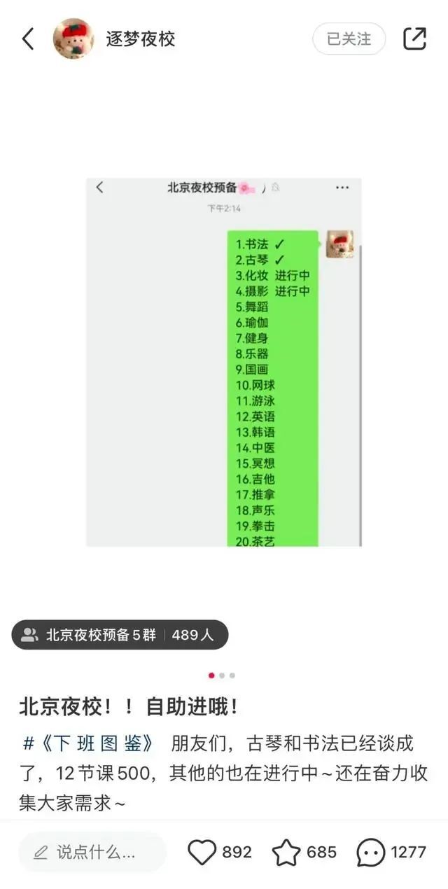 早在去年10月底,第一批嗅到夜校风口的发起人们,就在小红书发布了招募贴,有人在短短两三天内,就建立上千人的社群,一周之内便能组团开课;此前,上海市民夜校在开班报名时,甚至有65万人争抢1万个课程名额,由此可见需求之盛。大型网络社交平台孵化出的小社区、小圈子里,正在长出生活新潮流。