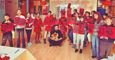 日前,中国驻欧盟使团和比利时布鲁塞尔中国文化中心等在布鲁塞尔举办“春节文化体验日”活动。图为当地学生手持自己书写的“福”字。龚 毅摄