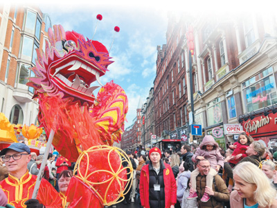 2月11日,英国伦敦华埠商会主办的新春庆典在伦敦举行。图为舞龙表演吸引了众多观众。本报记者 邢 雪摄