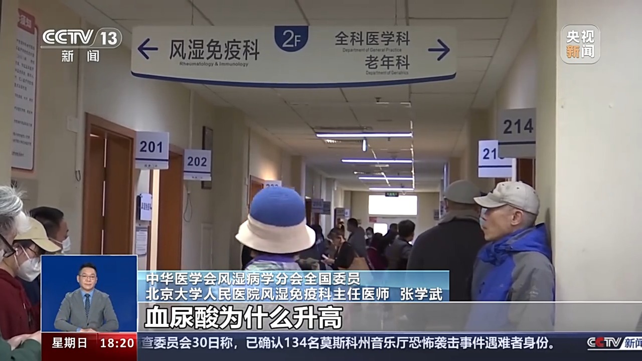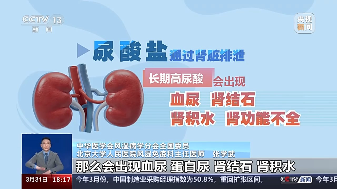 中华医学会风湿病学分会全国委员 北京大学人民医院风湿免疫科主任医师 张学武:长期的高尿酸血症,多余的尿酸盐会沉积到关节周围引起痛风关节炎,就是突然间的关节红肿热痛。第二,大量的尿酸盐是通过肾脏来排泄的,所以如果不加以控制就会出现血尿、蛋白尿、肾结石、肾积水、肾功能不全等。还有,长期高尿酸对全身血管也会有影响,会加重动脉硬化。此外,血尿酸对血糖也有干扰,会影响到胰岛代谢功能。