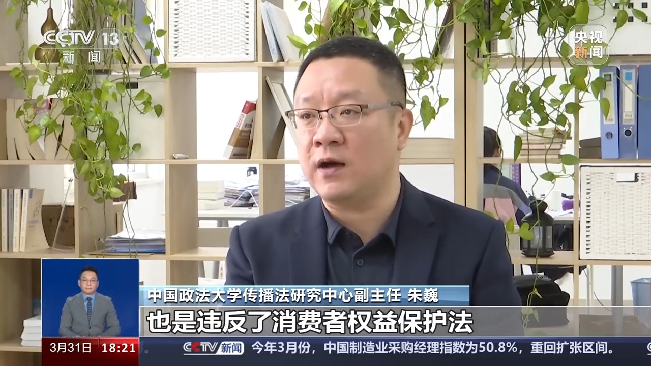 中国政法大学传播法研究中心副主任 朱巍:第一,违反食品安全法。绝对不允许有食疗代替药疗的宣传,这是一个违法宣传。第二,违反广告法,广告法及相关的法律法规对保健食品、医疗、医疗器械等有专门的具体规定,得有相关的资质,而且相关广告也经过固定的审核。这样把普通食品夸大宣传或者是令人混淆的宣传,是违反广告的法律法规的。另外一点,违反了消费者权益保护法。因为消费者看到可以替代药品,他可能购买了。限于表达的误区购买,这是一个明显的欺诈行为。