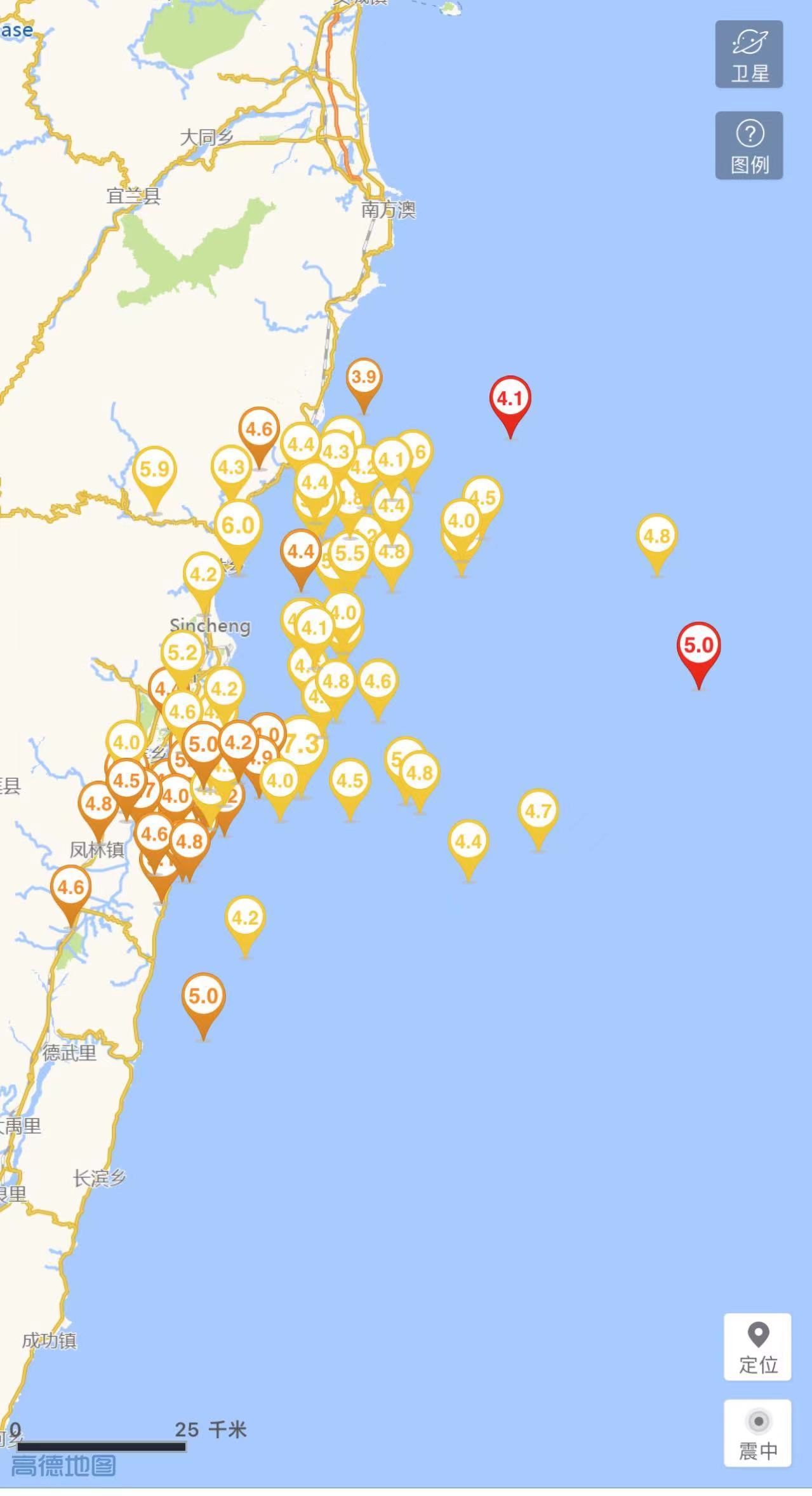 中国地震台网正式测定:4月25日02时11分,在台湾花莲县海域(北纬23.95度,东经122.31度)发生5.0级地震,震源深度10公里。