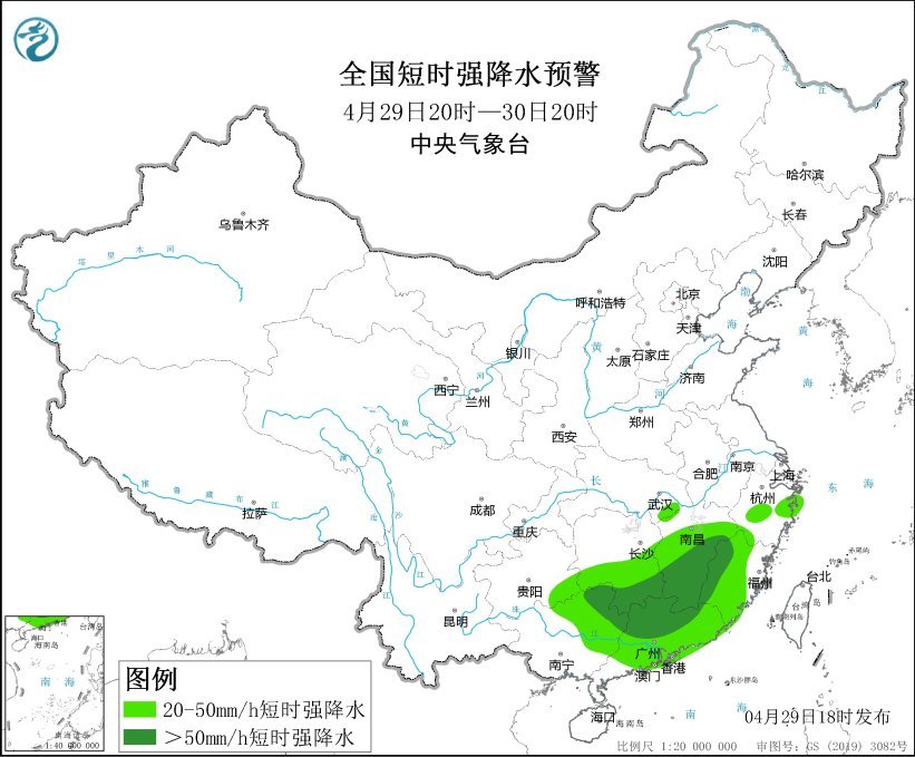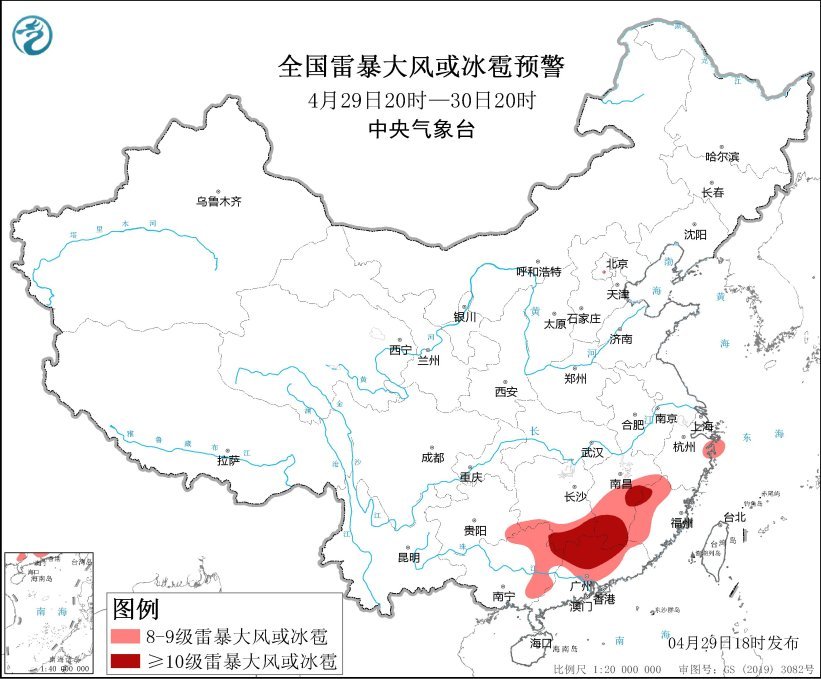 中央气象台4月29日18时升级发布强对流天气橙色预警:预计4月29日20时至30日20时,湖南南部、江西中南部、浙江东北部、福建中西部、贵州东南部、广西北部和东部、广东中北部等地的部分地区将有8级以上雷暴大风或冰雹天气,其中湖南南部、江西东部和南部、广东中北部、福建西北部、广西东北部等地的部分地区将有10级以上雷暴大风,最大风力12级以上,并可能有龙卷;湖北东南部、湖南中南部、江西、浙江中部、福建中西部、贵州东南部、广西东部和北部、广东等地的部分地区将有小时雨量大于20毫米的短时强降水天气,其中湖南南部、广西东北部、广东中北部、江西中南部、福建西部等地局地最大小时雨量大于50毫米,最大可达80毫米以上。