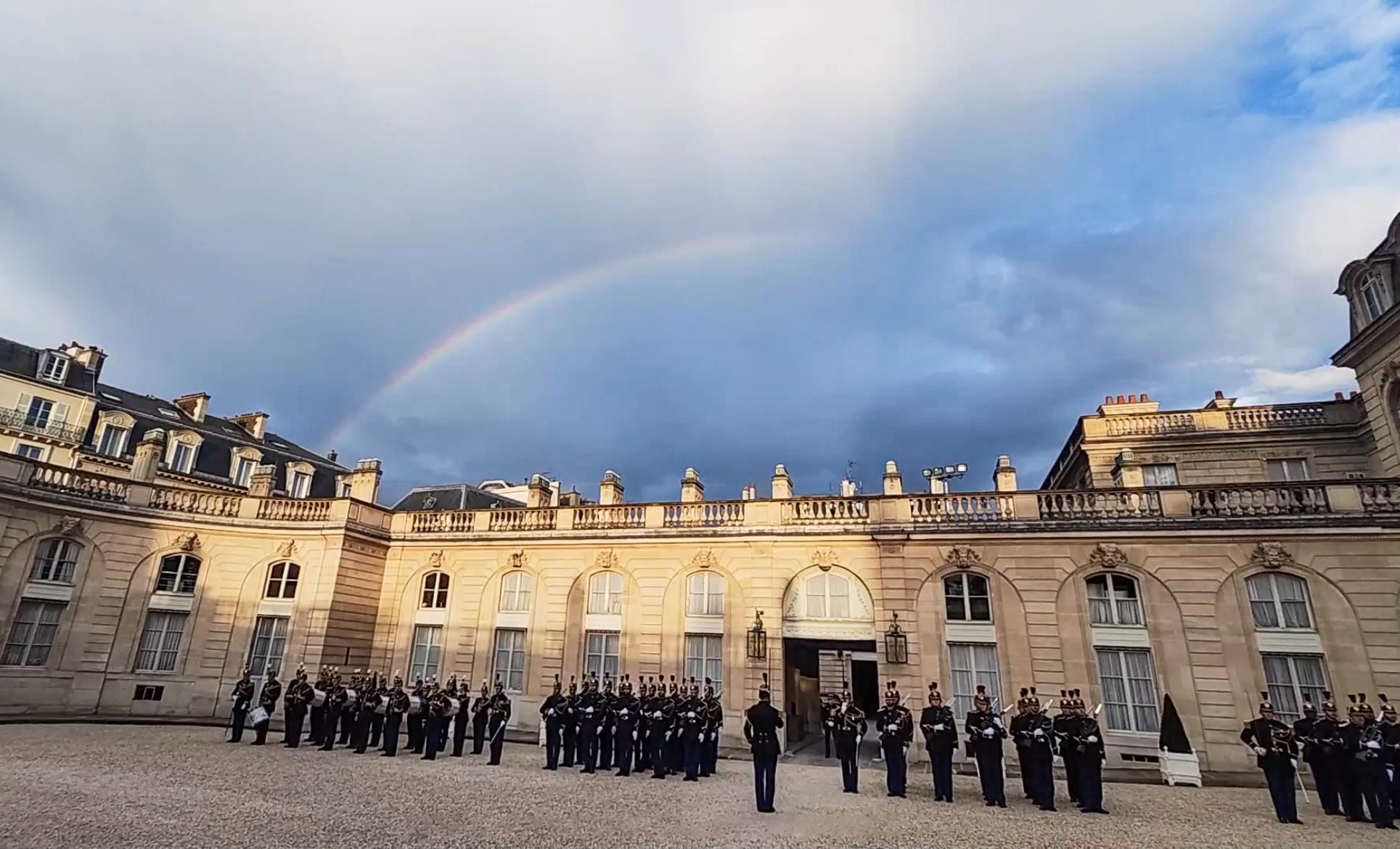 当地时间5月6日晚,习近平主席在巴黎出席马克龙总统举行的盛大欢迎宴会。宴会前,爱丽舍宫上空出现彩虹。彩虹连接着东西方。塞纳河畔,正写下中法两国“双向奔赴”的新故事。