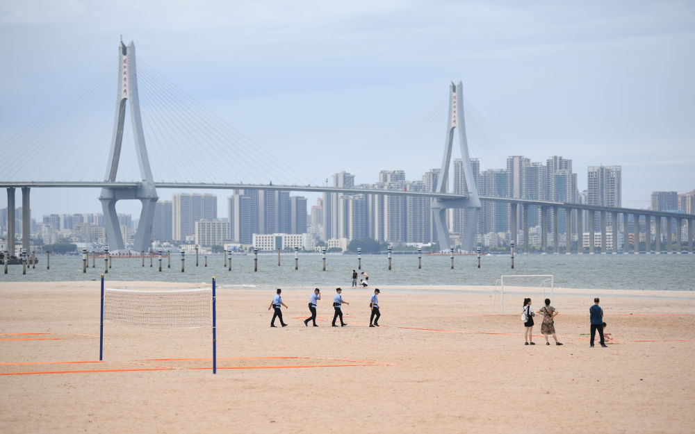 2023年7月17日,广东湛江五环广场的沙滩上,公安民警在执勤巡逻。新华社记者 邓华 摄