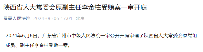 2024年6月6日,广东省广州市中级人民法院一审公开开庭审理了陕西省人大常委会原党组成员、副主任李金柱受贿一案。