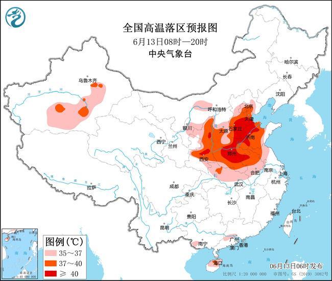 中央气象台6月13日06时继续发布高温橙色预警:预计6月13日白天,陕西中北部、山西中南部、河北大部、北京、天津、山东中西部、河南、江苏北部、安徽中北部、湖北北部、新疆南疆盆地、内蒙古西南部以及广东中部、广西南部、海南岛中北部等地有35℃以上的高温天气,其中,陕西中北部、山西中南部、河北中南部、北京东部和南部、天津、山东中西部、河南、安徽北部、江苏西北部、湖北西北部等地大部地区最高气温37~39℃,河北中南部、山东西北部、河南中北部等地部分地区可达40~42℃以上。