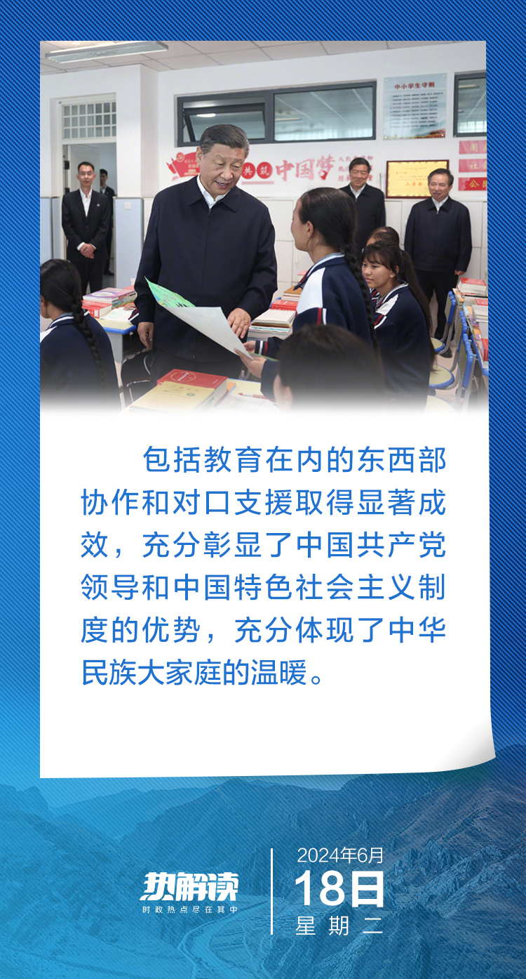 此次来到果洛西宁民族中学考察,总书记走进食堂,嘱咐食堂工作人员一定要确保学生饮食安全、营养可口。他来到教室观摩思政课,与学生们亲切交流。